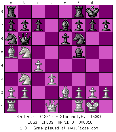 Last move : 1-0 2008 November 24 13:40:16 [Event "FICGS__CHESS__RAPID_D__000016"] [Site "FICGS"] [Date "2008.11.11"] [Round "1"] [White "Bester,Kazimierz"] [Black "Simonnet,Franck"] [Result "1-0"] [WhiteElo "1321"] [BlackElo "1500"] 1.e4 d5 2.exd5 Qxd5 3.Nc3 Qa5 4.Nf3 Nf6 5.Be2 Bf5 6.O-O e6 7.d3 Be7 8.Nd4 O-O 9.Nb3 Qb4 10.Bd2 Qd6 11.Nb5 Qb6 12.c4 Na6 13.Ba5 1-0 Scandinavian (centre counter) defense Kingside Castling by player White (move 6) Kingside Castling by player Black (move 8) Player White won this chess game. Follow this game move after move (download)A Chess game is divided into three stages: the first, when you hope you have the advantage, the second when you believe you have an advantage, and the third... when you know you're going to lose ! (Savielly Tartakower) Ich verachte die Medien. (Robert James Fischer) Morphy probablemente fue el genio más grande de todos. (Bobby Fischer) La guerre est enfant de la passion, la passion est enfant du narcissisme et le narcissisme est l'enfant. (...) Une autre partie ? (Thibault de Vassal) You can't play chess if you're groggy from pills. (Anatoly Karpov)