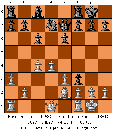 Last move : 0-1 2008 November 28 11:55:19 [Event "FICGS__CHESS__RAPID_D__000016"] [Site "FICGS"] [Date "2008.11.11"] [Round "1"] [White "Marques,Joao"] [Black "Siciliano,Pablo"] [Result "0-1"] [WhiteElo "1462"] [BlackElo "1351"] 1.d4 Nf6 2.Nc3 d5 3.Bg5 c6 4.e3 Nbd7 5.Nf3 e6 6.Be2 Be7 7.O-O O-O 8.a3 Ne4 9.Nxe4 dxe4 10.Bxe7 Qxe7 11.c4 exf3 0-1 Queen's pawn game Kingside Castling by player White (move 7) Kingside Castling by player Black (move 7) Player Black won this chess game. Follow this game move after move (download)Chess is a cold bath for the mind. (Sir John Simon) Ein Isolani verdüstert die Stimmung auf dem ganzen Schachbrett. (Savielly Grigorievitsch Tartakower) El Ajedrez es 99 por ciento táctica. (Teichmann) Il vaut toujours mieux jouer un plan faux de façon logique que de n'avoir pas de plan du tout. (Victor Kortchnoï) Macintosh - we might not get everything right, but at least we knew the century was going to end. (Douglas Adams)