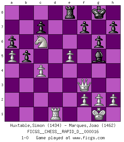 Last move : 1-0 2009 January 26 12:25:59 [Event "FICGS__CHESS__RAPID_D__000016"] [Site "FICGS"] [Date "2008.11.11"] [Round "1"] [White "Huxtable,Simon"] [Black "Marques,Joao"] [Result "1-0"] [WhiteElo "1434"] [BlackElo "1462"] 1.d4 Nf6 2.c4 e6 3.Nc3 d5 4.Bg5 Be7 5.Nf3 O-O 6.Bxf6 Bxf6 7.e4 dxc4 8.e5 Bh4 9.Bxc4 Nc6 10.Ne4 Be7 11.O-O a6 12.a4 Na5 13.Ba2 Nc6 14.Nc3 Nb4 15.Bb1 Qd7 16.Qe2 b6 17.Rd1 Bb7 18.Be4 Bc6 19.a5 Bxe4 20.Qxe4 b5 21.d5 Nxd5 22.Nxd5 exd5 23.Rxd5 Qe6 24.Rad1 Rad8 25.Rxd8 Bxd8 26.Nd4 Qc4 27.Qf3 Re8 28.Nc6 Bg5 29.b3 g6 30.bxc4 1-0 Queen's pawn game Kingside Castling by player Black (move 5) Kingside Castling by player White (move 11) Player White won this chess game. Follow this game move after move (download)Chess is a more highly symbolic game, but the aggressions are therefore even more frankly represented in the play. It probably began as a war game; that is, the representation of a miniature battle between the forces of two kingdoms. (Karl Meninger) Ja, jede Frau in Holland liebt mich bestimmt, und alle Männer hassen mich. (Loek van Wely) Puntos débiles o agujeros en la posición de tu oponente deben de ser ocupados por piezas, no Peones. (Siegbert Tarrasch) Je fais ceci parce que dans cinquante coups j'obtiendrai cela; je m'appelle Mikhail Moisevitch Botvinnik. (Botvinnik) Whoever said the pen is mightier than the sword obviously never encountered automatic weapons. (US General Douglas MacArthur)