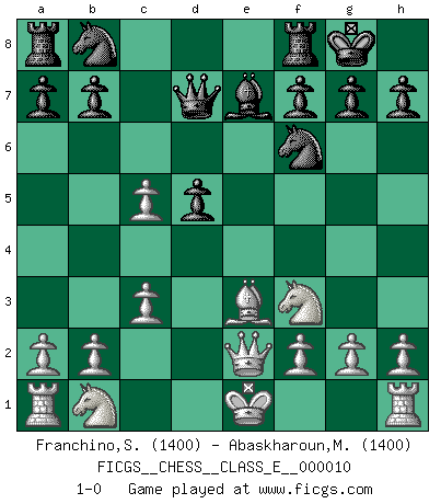 Last move : 1-0 2006 September 29 10:0:44 [Event "FICGS__CHESS__CLASS_E__000010"] [Site "FICGS"] [Date "2006.08.19"] [Round "1"] [White "Franchino,Sebastian"] [Black "Abaskharoun,Mena"] [Result "1-0"] [WhiteElo "1400"] [BlackElo "1400"] 1.e4 c5 2.c3 e6 3.d4 d5 4.Bb5 Bd7 5.Bxd7 Qxd7 6.exd5 exd5 7.Qe2 Be7 8.dxc5 Nf6 9.Nf3 O-O 10.Be3 1-0 This chess game has been lost on time (started : 2006.08.19 0:14:49) Sicilian : Alapin's variation (2.c3) Kingside Castling by player Black (move 9) Player White won this chess game. Follow this game move after move (download)Don't even mention losing to me. I can't stand to think of it. (Bobby Fischer) Auf jeden Fall musst du zuerst Rechtsanwalt werden, damit du deine eigenen Interessen und die deiner Familie vertreten kannst. [Brief an seinen Sohn] (José Raúl Capablanca) Yo no le temo a Spassky. Todos saben que yo soy el mejor. Uno no necesita un torneo para probarlo. (Bobby Fischer) La tactique est l'élément le plus important du milieu de jeu. (Siegbert Tarrasch) Players are not good because they find tactics, it is about the way to find the positions in which those tactics are hidden. (Luc-Olivier Leclerc)