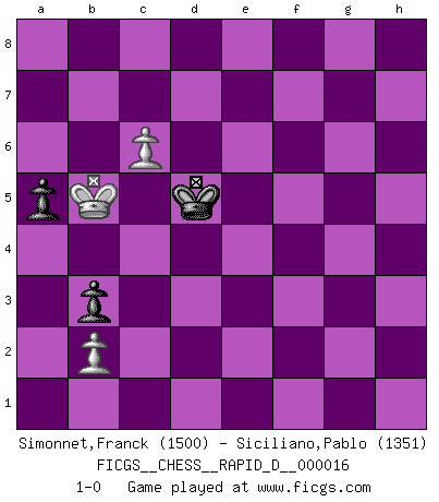 Last move : 1-0 2009 February 20 0:27:59 [Event "FICGS__CHESS__RAPID_D__000016"] [Site "FICGS"] [Date "2008.11.11"] [Round "1"] [White "Simonnet,Franck"] [Black "Siciliano,Pablo"] [Result "1-0"] [WhiteElo "1500"] [BlackElo "1351"] 1.d4 Nf6 2.c4 d6 3.Nc3 Nbd7 4.Nf3 e5 5.dxe5 dxe5 6.Bg5 Be7 7.e4 c6 8.Be2 Qc7 9.O-O O-O 10.Nh4 Nc5 11.Nf5 Bxf5 12.exf5 Rad8 13.Qc2 a5 14.a3 Ncd7 15.Ne4 Rfe8 16.Rfd1 Nxe4 17.Bxe7 Rxe7 18.Qxe4 Nf6 19.Qe3 b6 20.g4 Red7 21.g5 Rxd1+ 22.Rxd1 Rxd1+ 23.Bxd1 Qd6 24.Be2 Nd7 25.h4 Qd4 26.Qd3 Qxd3 27.Bxd3 Nc5 28.Bc2 a4 29.Kf1 Kf8 30.Ke2 Ke7 31.Ke3 f6 32.f4 exf4+ 33.Kxf4 Kf7 34.g6+ hxg6 35.fxg6+ Ke6 36.h5 Nb3 37.Bxb3 axb3 38.a4 Ke7 39.Kg4 c5 40.h6 gxh6 41.Kh5 Kf8 42.Kxh6 Kg8 43.g7 f5 44.Kg5 Kxg7 45.Kxf5 Kf7 46.Ke5 Ke7 47.Kd5 Kd7 48.a5 bxa5 49.Kxc5 Ke6 50.Kb5 Kd6 51.c5+ Kd5 52.c6 1-0 Old Indian defense Kingside Castling by player White (move 9) Kingside Castling by player Black (move 9) 10 pieces endgame at move 42 : White KPPPP , Black KPPPP WHITE : King + 4 Pawns BLACK : King + 4 Pawns 9 pieces endgame at move 44 : White KPPP , Black KPPPP WHITE : King + 3 Pawns BLACK : King + 4 Pawns 8 pieces endgame at move 45 : White KPPP , Black KPPP WHITE : King + 3 Pawns BLACK : King + 3 Pawns 7 pieces endgame at move 48 : White KPP , Black KPPP WHITE : King + 2 Pawns BLACK : King + 3 Pawns 6 pieces endgame at move 49 : White KPP , Black KPP WHITE : King + 2 Pawns BLACK : King + 2 Pawns Player White won this chess game. Follow this game move after move (download)Chess is ruthless: you've got to be prepared to kill people. (Nigel Short) Frage des Reporters: -Worin besteht das Ziel von Gambiteröffnungen? Antwort: -Auf Kosten der Partie einen Ruf als Angriffspieler zu erwerben.- (Siegbert Tarrasch) Hay jugadores fuertes y personas amables y yo soy un jugador fuerte. (Bobby Fischer) Votre prénom est 'Tactique', votre deuxième prénom est 'Tactique' et votre nom est 'Tactique'. (Ken Smith) Don't be discouraged. It's often the last key in the bunch that opens the lock. (Author unknown)