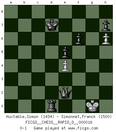 Last move : 0-1 2009 January 28 21:49:6 [Event "FICGS__CHESS__RAPID_D__000016"] [Site "FICGS"] [Date "2008.11.11"] [Round "1"] [White "Huxtable,Simon"] [Black "Simonnet,Franck"] [Result "0-1"] [WhiteElo "1434"] [BlackElo "1500"] 1.d4 Nf6 2.c4 e6 3.Nc3 Bb4 4.Qc2 c5 5.Qb3 cxd4 6.Qxb4 Nc6 7.Qa3 dxc3 8.Qxc3 Qc7 9.g3 O-O 10.Bg2 d5 11.cxd5 Nxd5 12.Qd2 Rd8 13.Bxd5 Rxd5 14.Qc2 Qa5+ 15.Kf1 Nd4 16.Qc3 Qb5 17.Be3 Nf5 18.b3 Bd7 19.Nf3 Rc8 20.Qb2 Nxe3+ 21.fxe3 e5 22.a4 Qc5 23.Kf2 Qd6 24.e4 Rdc5 25.a5 Bg4 26.b4 Rc2 27.Rhd1 Qxd1 28.Rxd1 Rxb2 29.Rd5 Bxf3 30.Kxf3 f6 31.b5 Rbc2 32.h4 R2c5 33.a6 bxa6 34.bxa6 Rxd5 35.exd5 Rc4 36.e4 Kf7 37.h5 Ra4 38.d6 Ke6 39.d7 Kxd7 40.g4 Rxa6 41.Ke3 Rd6 42.g5 a5 43.gxf6 gxf6 44.Kf3 a4 45.Kg4 a3 46.h6 a2 47.Kf3 a1Q 48.Ke2 Qd1+ 49.Kf2 Rd3 50.Kg2 Qe2+ 51.Kg1 Rd1+ 0-1 Nimzo-Indian : Classical, 4...c5 Kingside Castling by player Black (move 9) 10 pieces endgame at move 43 : White KPPP , Black KRPPPP WHITE : King + 3 Pawns BLACK : King + 1 Rook 4 Pawns 9 pieces endgame at move 43 : White KPP , Black KRPPPP WHITE : King + 2 Pawns BLACK : King + 1 Rook 4 Pawns Promotion Queen by player Black (move 47) Player Black won this chess game. Follow this game move after move (download)We like to think. (Gary Kasparov) Schach ist das schnellste Spiel der Welt, weil man in jeder Sekunde Tausende von Gedanken ordnen muß. (Albert Einstein) Tu puedes aprender mucho mas de una partida que pierdas que de una partida ganada. Tendras que perder cientos de partidas antes de llegar a ser un buen jugador. (Jose Raul Capablanca) Des combinaisons [dans le jeu d'échecs] pareilles à des mélodies. Je crois entendre pour ainsi dire la musique des coups... (Vladimir Nabokov) Industry executives and analysts often mistakenly talk about strategy as if it were some kind of chess match. But in chess, you have just two opponents, each with identical resources, and with luck playing a minimal role. The real world is much more like a poker game, with multiple players trying to make the best of whatever hand fortune has dealt them. In our industry, Bill Gates owns the table until someone proves otherwise. (David Moschella, 'Computerworld')