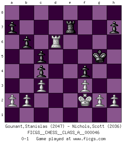 Last move : 0-1 2009 March 10 10:31:28 [Event "FICGS__CHESS__CLASS_A__000046"] [Site "FICGS"] [Date "2008.11.13"] [Round "1"] [White "Gounant,Stanislas"] [Black "Nichols,Scott"] [Result "0-1"] [WhiteElo "2047"] [BlackElo "2036"] 1.e4 e5 2.Nf3 Nf6 3.d4 Nxe4 4.Bd3 Nc6 5.Nxe5 Nc5 6.dxc5 Nxe5 7.Qe2 Qe7 8.O-O Nxd3 9.Qxd3 d5 10.Be3 Be6 11.Re1 Qd7 12.Bd4 f6 13.Nc3 Kf7 14.Ne2 b6 15.c6 Qxc6 16.Bxf6 Qc4 17.Qxc4 dxc4 18.Be5 c6 19.Rad1 Bc5 20.Bd6 Bxd6 21.Rxd6 c5 22.Ng3 Rhe8 23.f3 Re7 24.c3 Rae8 25.Red1 g6 26.R6d2 Bf5 27.Nxf5 gxf5 28.Rd7 Kf6 29.R1d6+ Kg5 30.Rxe7 Rxe7 31.Kf2 f4 0-1 Petrov : Modern attack, Symmetrical variation Kingside Castling by player White (move 8) Player Black won this chess game. Follow this game move after move (download)Alekhine is a poet who creates a work of art out of something that would hardly inspire another man to send home a picture post card. (Max Euwe) Die jungen Leute sollen verstehen, dass sie noch etwas von mir lernen können und müssen. (Viktor Kortschnoi) El jugador de combinación piensa hacia adelante; comienza de la posición dada y trabaja las movidas contundentes en su mente. (Emanuel Lasker) Vous n'êtes pas toujours obligé de jouer le meilleur coup. Un coup doit être actif, entreprenant, correct et beau ! (David Bronstein) Nothing is more important for teaching us to understand the concepts we have than constructing fictitious ones. (Ludwig Wittgenstein)