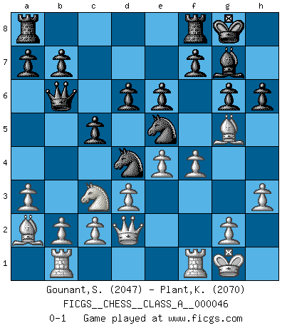 Last move : 0-1 2009 March 23 11:45:54 [Event "FICGS__CHESS__CLASS_A__000046"] [Site "FICGS"] [Date "2008.11.13"] [Round "1"] [White "Gounant,Stanislas"] [Black "Plant,Kevin D."] [Result "0-1"] [WhiteElo "2047"] [BlackElo "2070"] 1.e4 c5 2.Nc3 Nc6 3.Nf3 d6 4.Bc4 Nf6 5.a3 g6 6.O-O Bg7 7.d3 Bg4 8.h3 Bxf3 9.Qxf3 O-O 10.Bg5 e6 11.Qe3 Nd4 12.Qd2 Qa5 13.Rad1 Qb6 14.Rb1 Nd7 15.Ba2 Ne5 16.f4 h6 0-1 Sicilian : Closed, 2...Nc6 Kingside Castling by player White (move 6) Kingside Castling by player Black (move 9) Player Black won this chess game. Follow this game move after move (download)Not only will I predict his triumph over Botvinnik, but I'll go further and say that he'll probably be the greatest Chess player that ever lived. (John Collins) Habe Mut, dich deines eigenen Verstandes zu bedienen. (Immanuel Kant) Antes de los Finales, los dioses han colocado el Juego Medio. (Siegbert Tarrasch) Il s'avisa de me proposer d'apprendre les échecs qu'il jouait un peu... me voilà forcené des échecs. J'achète un échiquier, je m'enferme dans ma chambre, j'y passe des jours et des nuits à vouloir apprendre par cur toutes les parties. (Jean-Jacques Rousseau, Confessions) Follow your passion, and success will follow you. (Arthur Buddhold)