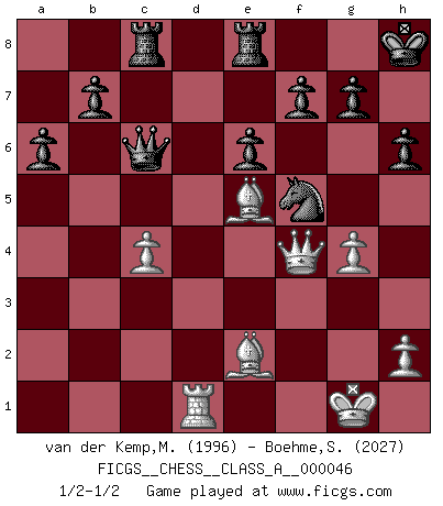 Last move : 1/2-1/2 2009 January 10 19:3:33 [Event "FICGS__CHESS__CLASS_A__000046"] [Site "FICGS"] [Date "2008.11.13"] [Round "1"] [White "van der Kemp,Michel"] [Black "Boehme,Sebastian"] [Result "1/2-1/2"] [WhiteElo "1996"] [BlackElo "2027"] 1.e4 c5 2.Nf3 d6 3.d4 cxd4 4.Nxd4 Nf6 5.Nc3 a6 6.Bg5 e6 7.f4 Qb6 8.Qd2 Qxb2 9.Rb1 Qa3 10.e5 dxe5 11.fxe5 h6 12.Bh4 Nfd7 13.Ne4 Qxa2 14.Rd1 Qd5 15.Qe3 Qxe5 16.Be2 Bc5 17.Bg3 Qd5 18.c4 Bxd4 19.Rxd4 Qa5+ 20.Rd2 O-O 21.Bd6 Nc6 22.O-O Re8 23.Qg3 Ne7 24.Bc7 Qb4 25.Bd6 Qa5 26.Bc7 Qb4 27.Rxd7 Bxd7 28.Nf6+ Kh8 29.Nxd7 Nf5 30.Qf4 Rac8 31.g4 Qe7 32.Be5 Qxd7 33.Rd1 Qc6 1/2-1/2 Sicilian : Najdorf, 7...Qb6 Kingside Castling by player Black (move 20) Kingside Castling by player White (move 22) This chess game ended in a draw. Follow this game move after move (download)In Chess, just as in life, today's bliss may be tomorrow's poison. (Assaic) Es gibt keine einzige Frau, der ich nicht einen Springer vorgeben könnte und trotzdem gewänne. (Robert James Fischer) El Ajedrez es la vida. (Bobby Fischer) Les Echecs ont trois composantes : le temps, l'espace et le matériel en dernier. (Mikhail Tal) Luck is when opportunity knocks and you answer. (Anonymous)