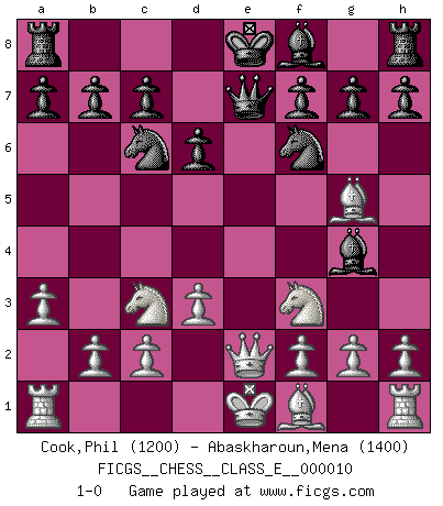 Last move : 1-0 2006 October 1 4:10:33 [Event "FICGS__CHESS__CLASS_E__000010"] [Site "FICGS"] [Date "2006.08.19"] [Round "1"] [White "Cook,Phil"] [Black "Abaskharoun,Mena"] [Result "1-0"] [WhiteElo "1200"] [BlackElo "1400"] 1.e4 e5 2.Nf3 Nf6 3.Nxe5 d6 4.Nf3 Nxe4 5.Qe2 Qe7 6.d3 Nf6 7.Nc3 Nc6 8.a3 Bg4 9.Bg5 1-0 This chess game has been lost on time (started : 2006.08.19 0:14:49) Petrov : Cozio (Lasker) attack Player White won this chess game. Follow this game move after move (download)The game of Chess is not merely an idle amusement; several very valuable qualities of the mind are to be acquired and strengthened by it, so as to become habits ready on all occasions; for life is a kind of Chess. (Benjamin Franklin) Jeder Schachmeister war einmal ein Anfänger. (Irving Chernev) Nunca nadie ha ganado una partida de Ajedrez rindiendose. (Unknown) Le système Elo représente seulement une moyenne. Il est simplement un indicateur de votre stabilité. (Anatoli Karpov) Now the reason the enlightened prince and the wise general conquer the enemy whenever they move and their achievements surpass those of ordinary men is foreknowledge. (Sun Tzu)
