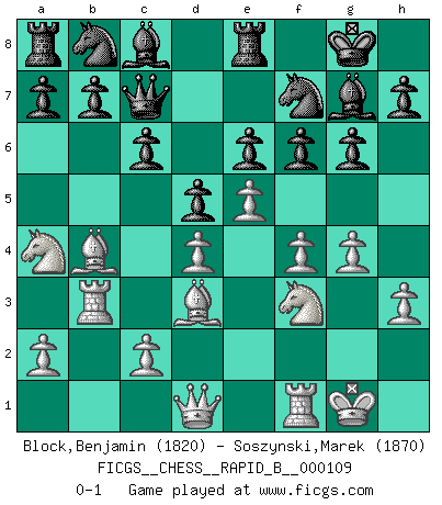 Last move : 0-1 2009 February 9 8:52:0 [Event "FICGS__CHESS__RAPID_B__000109"] [Site "FICGS"] [Date "2008.11.14"] [Round "1"] [White "Block,Benjamin"] [Black "Soszynski,Marek"] [Result "0-1"] [WhiteElo "1820"] [BlackElo "1870"] 1.e4 c6 2.d4 d5 3.e5 g6 4.f4 Bg7 5.Nf3 Nh6 6.Nc3 O-O 7.h3 Qb6 8.g4 f6 9.Bd3 Nf7 10.Bd2 Qxb2 11.Rb1 Qa3 12.O-O e6 13.Rb3 Qe7 14.Na4 Re8 15.Bb4 Qc7 0-1 This chess game has been lost on time (started : 2008.11.14 23:46:39) Caro-Kann : Advance variation Kingside Castling by player Black (move 6) Kingside Castling by player White (move 12) Player Black won this chess game. Follow this game move after move (download)Chess holds its master in its own bonds, shackling the mind and brain so that the inner freedom of the very strongest must suffer. (Albert Einstein) Intelligenz läßt sich nicht am Weg, sondern nur am Ergebnis feststellen. (Garry Kasparov) Una clavada es mas poderosa que una espada. (Fred Reinfeld) Les pièces de l'échiquier étaient impitoyables. Elles le retenaient, elles l'absorbaient. Il y avait de l'horreur en cela, mais aussi une harmonie unique. Car, qu'y a-t-il dans le monde, à part les échecs ? (V. Nabokov) The general who wins the battle makes many calculations in his temple before the battle is fought. The general who loses makes but few calculations beforehand. (Sun Tzu)