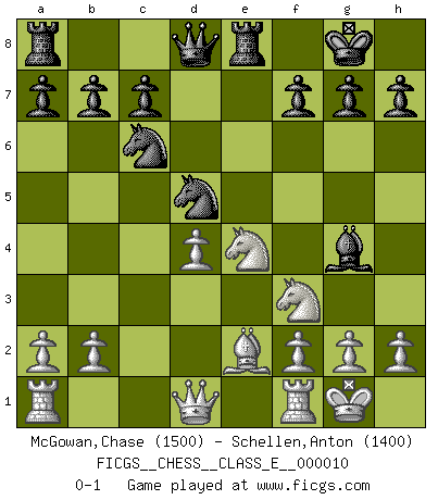 Last move : 0-1 2006 November 20 14:30:33 [Event "FICGS__CHESS__CLASS_E__000010"] [Site "FICGS"] [Date "2006.08.19"] [Round "1"] [White "McGowan,Chase"] [Black "Schellen,Anton"] [Result "0-1"] [WhiteElo "1500"] [BlackElo "1400"] 1.e4 e5 2.Nf3 Nc6 3.Bc4 Bc5 4.c3 Nf6 5.d4 exd4 6.cxd4 Bb4+ 7.Bd2 Bxd2+ 8.Nbxd2 O-O 9.O-O d5 10.exd5 Nxd5 11.Ne4 Bg4 12.Be2 Re8 0-1 Giuoco Piano Kingside Castling by player Black (move 8) Kingside Castling by player White (move 9) Player Black won this chess game. Follow this game move after move (download)It was clear to me that the vulnerable point of the American Grandmaster (Bobby Fischer) was in double-edged, hanging, irrational positions, where he often failed to find a win even in a won position. (Efim Geller) Es ist schade, dass viele Schachsportler vergessen, wie wichtig Auftreten und angemessene Kleidung sind. (Alexandra Kosteniuk) El Ajedrez es el arte del análisis. (Mikhail Botvinnik) Ce qui est bien, c'est d'avoir tout un tas de pièces en prise : l'adversaire ne peut en prendre qu'une à la fois. Cité par Thierry Audin. Don't anthropomorphize computers - they hate it. (Anonymous)