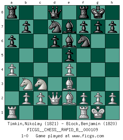 Last move : 1-0 2009 February 10 8:57:49 [Event "FICGS__CHESS__RAPID_B__000109"] [Site "FICGS"] [Date "2008.11.14"] [Round "1"] [White "Timkin,Nikolay"] [Black "Block,Benjamin"] [Result "1-0"] [WhiteElo "1821"] [BlackElo "1820"] 1.e4 c5 2.Nf3 d6 3.d4 cxd4 4.Nxd4 Nf6 5.Nc3 a6 6.Be2 e5 7.Nb3 Be7 8.Be3 O-O 9.O-O Be6 10.Qd2 Nbd7 11.a4 1-0 This chess game has been lost on time (started : 2008.11.14 23:46:39) Sicilian : Najdorf, Opovcensky variation Kingside Castling by player Black (move 8) Kingside Castling by player White (move 9) Player White won this chess game. Follow this game move after move (download)Chess, like any creative activity, can exist only through the combined efforts of those who have creative talent, and those who have the ability to organize their creative work. (Mikhail Botvinnik) Frage des Reporters: -Welche besonderen Umstände rechtfertigen das Anhalten der Uhren während einer Turnierpartie? Antwort: -Einen Fotographen zu strangulieren. (Siegbert Tarrasch) Cada Peón es una Reina en potencia. (James Mason) Toutes les manuvres exécutées sur une colonne ouverte ont pour but ultime l'intrusion définitive sur la septième ou la huitième rangée, en plein cur de la position ennemie. (Aaron Nimzovitch) If you are good, you will be assigned all the work. If you are really good, you will get out of it. (Dan Rotaru)