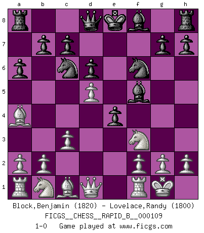Last move : 1-0 2009 January 8 18:11:59 [Event "FICGS__CHESS__RAPID_B__000109"] [Site "FICGS"] [Date "2008.11.14"] [Round "1"] [White "Block,Benjamin"] [Black "Lovelace,Randy"] [Result "1-0"] [WhiteElo "1820"] [BlackElo "1800"] 1.e4 e5 2.Nf3 Nc6 3.Bb5 a6 4.Ba4 d6 5.c3 f5 6.exf5 Bxf5 7.O-O Nf6 8.d4 e4 9.d5 1-0 This chess game has been lost on time (started : 2008.11.14 23:46:39) Ruy Lopez : Siesta, Kopayev variation Kingside Castling by player White (move 7) Player White won this chess game. Follow this game move after move (download)Pawns are born free, yet they are everywhere in chains. (Rick Kennedy) Kann Schach nicht schließlich das Nationalspiel der Deutschen werden? Und welche weiteren Ausblicke bieten sich dann dar! Welche Hebung des allgemeinen Kultur-Niveaus, ja der Moral, wenn das Schachbrett den Kartentisch verdrängen würde! Wahrlich, ein Ziel, des Schweißes der Edlen wert! (Siegbert Tarrasch) Los Peones son nacidos libres, y aún así, se encuentran encadenados por todos lados. (Rick Kennedy) La menace est plus forte que l'exécution. (Aaron Nimzovitch) A computer lets you make more mistakes faster than any invention in human history - with the possible exceptions of handguns and tequila. (Mitch Ratcliffe)