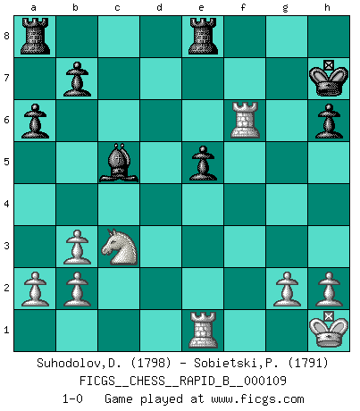 Last move : 1-0 2009 February 1 20:23:42 [Event "FICGS__CHESS__RAPID_B__000109"] [Site "FICGS"] [Date "2008.11.14"] [Round "1"] [White "Suhodolov,Dmitry"] [Black "Sobietski,Piotr"] [Result "1-0"] [WhiteElo "1798"] [BlackElo "1791"] 1.e4 c5 2.Nf3 d6 3.d4 cxd4 4.Nxd4 Nf6 5.Nc3 a6 6.Bc4 e6 7.Bb3 Nbd7 8.Bg5 Nc5 9.f4 Be7 10.Qf3 h6 11.Bh4 Qc7 12.O-O O-O 13.Rae1 Rd8 14.f5 Nxb3 15.cxb3 Bd7 16.Qh3 Qc5 17.Bf2 Qa5 18.fxe6 fxe6 19.Nxe6 Re8 20.e5 dxe5 21.Qg3 Nh5 22.Qg6 Bb4 23.Be3 Bxe6 24.Qxh5 Qc7 25.Bxh6 gxh6 26.Rf6 Bf8 27.Qg6+ Qg7 28.Rxe6 Bc5+ 29.Kh1 Qxg6 30.Rxg6+ Kh7 31.Rf6 1-0 This chess game has been lost on time (started : 2008.11.14 23:46:39) Sicilian : Najdorf, Lipnitzky attack Kingside Castling by player White (move 12) Kingside Castling by player Black (move 12) Player White won this chess game. Follow this game move after move (download)You sit at the board and suddenly your heart leaps. Your hand trembles to pick up the piece and move it. But what Chess teaches you is that you must sit there calmly and think about whether it's really a good idea and whether there are other better ideas. (Stanley Kubrick) Die Auseinandersetzung mit Karpow war politisch geprägt. Er stand für das kommunistische System, wurde von dessen Repräsentanten gehätschelt. Ich war der Oppositionelle. Jeder Schachweltmeister spiegelt auch die gesellschaftlichen Verhältnisse wider. Kramnik steht für die Börsen-Generation des Neuen Markts, ideologiefrei, zahlenfixiert. (Garry Kasparov) La vida es como un juego de Ajedrez, cambiando con cada movimiento. (Proverbio Chino) Soyez une menace à chaque fois que vous vous asseyez pour jouer. (Ken Smith) Chess is everything: art, science and sport. (Anatoly Karpov)