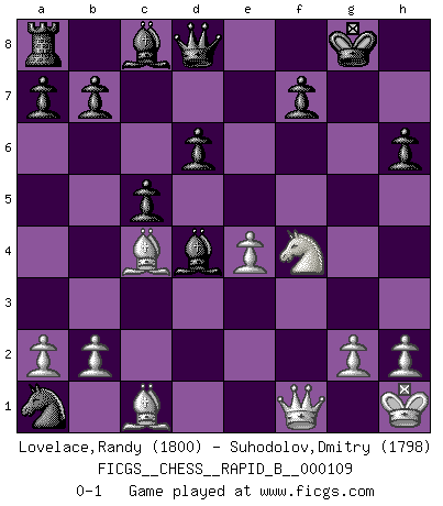Last move : 0-1 2009 January 13 18:48:53 [Event "FICGS__CHESS__RAPID_B__000109"] [Site "FICGS"] [Date "2008.11.14"] [Round "1"] [White "Lovelace,Randy"] [Black "Suhodolov,Dmitry"] [Result "0-1"] [WhiteElo "1800"] [BlackElo "1798"] 1.e4 c5 2.Nc3 d6 3.f4 g6 4.Nf3 Bg7 5.Bc4 Nc6 6.O-O e6 7.d3 Nge7 8.f5 exf5 9.Qe1 h6 10.Nh4 O-O 11.exf5 Nxf5 12.Nxg6 Re8 13.Qd2 Nb4 14.Nf4 Bd4+ 15.Kh1 Ne3 16.Qf2 Nxf1 17.Qxf1 Nxc2 18.Ne4 Rxe4 19.dxe4 Nxa1 0-1 This chess game has been lost on time (started : 2008.11.14 23:46:39) Sicilian : Closed Kingside Castling by player White (move 6) Kingside Castling by player Black (move 10) Player Black won this chess game. Follow this game move after move (download)In Chess, as it is played by masters, chance is practically eliminated. (Emanuel Lasker) Karpov ist ein Museumsstück. (Garry Kasparov) La maestría del Ajedrez consiste esencialmente en analizar posiciónes de Ajedrez con precisión. (Mikhail Botvinnik) Les échecs sont un jeu terrible. Si vous n'avez pas le centre, votre adversaire a une position plus libre. Par contre, si vous avez le centre, alors vous avez vraiment quelque chose pour laquelle vous inquiéter ! (Siegbert Tarrasch) Wikichess, chess moves explained by 'experimented' players. (Thibault de Vassal)