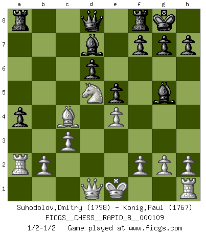 Last move : 1/2-1/2 2009 January 13 5:33:25 [Event "FICGS__CHESS__RAPID_B__000109"] [Site "FICGS"] [Date "2008.11.14"] [Round "1"] [White "Suhodolov,Dmitry"] [Black "Konig,Paul"] [Result "1/2-1/2"] [WhiteElo "1798"] [BlackElo "1767"] 1.e4 c5 2.Nf3 Nc6 3.d4 cxd4 4.Nxd4 Nf6 5.Nc3 e5 6.Ndb5 d6 7.Bg5 a6 8.Na3 b5 9.Nd5 Be7 10.Bxf6 Bxf6 11.c3 Bg5 12.Nc2 O-O 13.a4 bxa4 14.Rxa4 Ne7 15.Bc4 a5 16.Nce3 Nxd5 17.Nxd5 Bd7 18.Ra2 a4 1/2-1/2 Sicilian : Pelikan (Lasker/Sveshnikov) variation Kingside Castling by player Black (move 12) This chess game ended in a draw. Follow this game move after move (download)Chess is like war on a board. (Bobby Fischer) Es gibt nur zwei wahre Schachgenies - das andere war Wilhelm Steinitz, der Weltmeister von 1872 bis 1894. (Robert James Fischer) El juego del Ajedrez no es solamente una diversión quieta; algunas cualidades muy valuables de la mente se pueden adquirir y cultivar con el, como convertirlos en habitos disponibles para toda ocasión; ya que la vida es algo así como el Ajedrez. (Benjamin Franklin) C'est une question de caractère, Beaucoup de gens perdent leur motivation très vite. D'autres, ils sont rares, peuvent la conserver très longtemps. J'aime les échecs, encore aujourd'hui je suis heureux d'analyser des parties. J'aime toujours gagner, je déteste encore perdre. Bien jouer est important pour mon intégrité intellectuelle et morale. Et puis les échecs vivent en ce moment une période historique grâce à Internet. Ils se développent dans les systèmes éducatifs à travers le monde. Ils sortent de leur ghetto, et c'est mon rôle de mener à bien cette révolution. (Gary Kasparov) War is the child of passion, passion is the child of narcissism and narcissism is the child. (...) Another game ? (Thibault de Vassal)