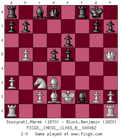 Last move : 1-0 2009 March 15 18:33:41 [Event "FICGS__CHESS__CLASS_B__000062"] [Site "FICGS"] [Date "2008.11.15"] [Round "1"] [White "Soszynski,Marek"] [Black "Block,Benjamin"] [Result "1-0"] [WhiteElo "1870"] [BlackElo "1820"] 1.e4 c5 2.d4 cxd4 3.Qxd4 Nc6 4.Qe3 Nf6 5.Nf3 e6 6.Nc3 Bb4 7.Bd3 O-O 8.Bd2 d5 9.a3 Ba5 10.e5 Nh5 11.b4 Bb6 12.Qe2 f6 13.b5 Nxe5 14.Nxe5 fxe5 15.Qxh5 Bxf2+ 16.Ke2 1-0 This chess game has been lost on time (started : 2008.11.15 20:31:21) Sicilian : Smith-Morra gambit Kingside Castling by player Black (move 7) Player White won this chess game. Follow this game move after move (download)Adequate compensation for a sacrifice is having a sound combination leading to a winning position; adequate compensation for a blunder is having your opponent snatch defeat from the jaws of victory. (Bruce A. Moon) Ich kenne keine einzige Person, die behaupten würde, Garri Kasparow sei ein guter Mensch (Nigel Short) Los Peones son nacidos libres, y aún así, se encuentran por doquier encadenados. (Rick Kennedy) Les pièces de l'échiquier étaient impitoyables. Elles le retenaient, elles l'absorbaient. Il y avait de l'horreur en cela, mais aussi une harmonie unique. Car, qu'y a-t-il dans le monde, à part les échecs ? (V. Nabokov) There is no instance of a country having benefited from prolonged warfare. (Sun Tzu)
