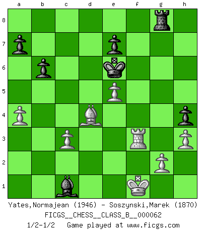 Last move : 1/2-1/2 2009 March 24 15:5:42 [Event "FICGS__CHESS__CLASS_B__000062"] [Site "FICGS"] [Date "2008.11.15"] [Round "1"] [White "Yates,Normajean"] [Black "Soszynski,Marek"] [Result "1/2-1/2"] [WhiteElo "1946"] [BlackElo "1870"] 1.e4 c6 2.d4 d5 3.Nc3 g6 4.f3 Bg7 5.Be3 Qb6 6.Qd2 dxe4 7.fxe4 Qxb2 8.Rb1 Qa3 9.e5 h5 10.Nf3 Nh6 11.Bd3 Nf5 12.Bg5 Qa5 13.O-O Na6 14.Nh4 Nc7 15.Nxf5 gxf5 16.Rb3 c5 17.Nd5 Qxd2 18.Nxc7+ Kd8 19.Bxd2 Kxc7 20.Rc3 b6 21.Bxf5 Bxf5 22.Rxf5 Rad8 23.Be3 Kd7 24.Rxf7 cxd4 25.Bxd4 Bh6 26.Rcf3 Ke6 27.c3 h4 28.Kf1 Rdg8 29.h3 Rg6 30.R7f5 Bc1 31.Rf8 Rhg8 32.Rxg8 Rxg8 33.a4 1/2-1/2 Caro-Kann : Gurgenidze system Kingside Castling by player White (move 13) This chess game ended in a draw. Follow this game move after move (download)Weak points or holes in the opponent's position must be occupied by pieces not Pawns. (Siegbert Tarrasch) Zu meiner Zeit war ein 20 jähriger ein junger Spieler, heute ist er ein Veteran. (Garry Kasparov) Aquel que ve no otra dirección en el juego que la de dar Jaque Mate a su oponente, nunca será un buen jugador de Ajedrez. (Euwe) La conception d'un plan est le processus par lequel un joueur exploite les avantages de sa position tout en s'efforçant d'en réduire au minimum les inconvénients. Afin de garantir le succès, un plan doit toujours se fonder sur un diagnostic objectif des particularités d'une position. La conception d'un plan est d'autant plus difficile que la position est équilibrée, et grandement facilitée lorsqu'il n'existe qu'un seul plan susceptible de répondre aux exigences de la position. (Harry Golombek) When you stop learning you start dying. (M. Scott Adams)