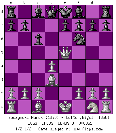 Last move : 1/2-1/2 2008 December 23 15:18:22 [Event "FICGS__CHESS__CLASS_B__000062"] [Site "FICGS"] [Date "2008.11.15"] [Round "1"] [White "Soszynski,Marek"] [Black "Colter,Nigel"] [Result "1/2-1/2"] [WhiteElo "1870"] [BlackElo "1858"] 1.e4 c6 2.Nc3 d5 3.Qf3 dxe4 4.Nxe4 Nd7 5.d4 Ngf6 6.Bd3 Nxe4 7.Qxe4 Nf6 8.Qe5 Ng4 9.Qe4 Nf6 10.Qe5 1/2-1/2 Caro-Kann : GOldman (Spielmann) variation This chess game ended in a draw. Follow this game move after move (download)Different people feel differently about resigning. (Bobby Fischer) Das Zentrum ist der Balkan des Schachbretts - Kriegshandlungen können in jedem Moment ausbrechen. (Aaron Nimzowitsch) Debes de llevar a tu oponente hacia un profundo y obscuro bosque donde 2+2=5, y el camino que conduce a la salida es suficientemente ancho para solamente uno. (Mikhail Tal) Des idées, des idées, j'en ai cent, j'en ai mille. Des bonnes, des mauvaises, applicables, irréalisables... Il suffit de faire le tri ! (Roos) The meaning of life is that it is to be lived, and it is not to be traded and conceptualized and squeezed into a pattern of systems. (Bruce Lee)