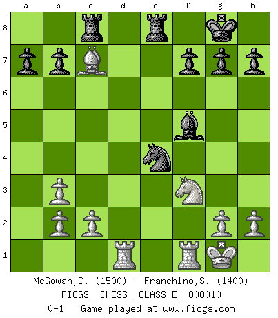 Last move : 0-1 2006 November 12 4:12:25 [Event "FICGS__CHESS__CLASS_E__000010"] [Site "FICGS"] [Date "2006.08.19"] [Round "1"] [White "McGowan,Chase"] [Black "Franchino,Sebastian"] [Result "0-1"] [WhiteElo "1500"] [BlackElo "1400"] 1.e4 e5 2.Nc3 Nf6 3.Bc4 Bb4 4.d3 d6 5.f4 Nc6 6.f5 Na5 7.Bb3 Nxb3 8.axb3 d5 9.Bd2 O-O 10.Nf3 dxe4 11.dxe4 Bxc3 12.Bxc3 Qxd1 13.Rxd1 Re8 14.O-O Nxe4 15.Bxe5 Bxf5 16.Bxc7 Rac8 0-1 Vienna game Kingside Castling by player Black (move 9) Kingside Castling by player White (move 14) Player Black won this chess game. Follow this game move after move (download)Chess is like life. (Boris Spassky) Ich organisiere ein großes Turnier, was mich etwa 120000 Dollar kostet. Ich denke, das ist das erste Mal in der Schachgeschichte, daß ein Schachgroßmeister auch als Mäzen auftritt. (Miguel Najdorf) EL Ajedrez es como la vida. (Boris Spassky) J'ai toujours senti une vague pitié pour l'homme qui ne connaît rien aux échecs, tout comme j'en aurais pour un homme ignorant de l'amour. Les Echecs, comme la musique ou comme l'amour, ont le pouvoir de rendre heureux. (Siegbert Tarrasch) As the days dwindle down... to a precious few. (Maxwell Anderson)