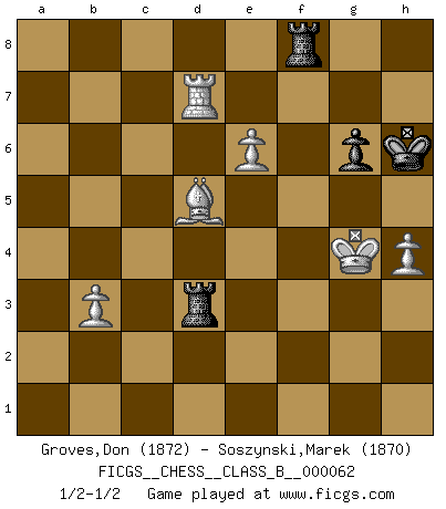 Last move : 1/2-1/2 2008 November 26 23:49:22 [Event "FICGS__CHESS__CLASS_B__000062"] [Site "FICGS"] [Date "2008.11.15"] [Round "1"] [White "Groves,Don"] [Black "Soszynski,Marek"] [Result "1/2-1/2"] [WhiteElo "1872"] [BlackElo "1870"] 1.e4 c6 2.d4 d5 3.exd5 cxd5 4.c4 g6 5.Nc3 Nf6 6.Qb3 Bg7 7.cxd5 O-O 8.g3 e6 9.dxe6 Nc6 10.exf7+ Kh8 11.Nf3 Bg4 12.Bg2 Bxf3 13.Bxf3 Nxd4 14.Qd1 Qe7+ 15.Be3 Nf5 16.Qe2 Qxf7 17.O-O Rae8 18.Rad1 Bh6 19.Rd3 Nxe3 20.fxe3 a6 21.Rfd1 b5 22.Kg2 b4 23.Nd5 Nxd5 24.Bxd5 Qd7 25.e4 Bg7 26.a3 a5 27.axb4 axb4 28.b3 Qc7 29.Re1 Qa7 30.R3d1 Qc5 31.Bc4 Qe7 32.Qe3 Bc3 33.Re2 Qf6 34.Rc2 Ra8 35.h4 Qe7 36.Rxc3 bxc3 37.Qxc3+ Qg7 38.Qxg7+ Kxg7 39.Rd7+ Kh8 40.e5 Ra2+ 41.Kh3 h5 42.Bf7 Kg7 43.Bd5 Kh6 44.g4 hxg4+ 45.Kxg4 Rd2 46.e6 Rd4+ 47.Kg3 Rd3+ 48.Kg4 1/2-1/2 Caro-Kann : Panov-Botvinnik attack Kingside Castling by player Black (move 7) Kingside Castling by player White (move 17) 10 pieces endgame at move 45 : White KRBPPP , Black KRRP WHITE : King + 1 Rook 1 Bishop 3 Pawns BLACK : King + 2 Rooks 1 Pawn This chess game ended in a draw. Follow this game move after move (download)Spassky will not be psyched out by Fischer. (Mike Goodall) Schach ist ein Reich, wo sich die menschliche Phantasie frei entfalten kann. (David Bronstein) El Ajedrez lo es todo: arte, ciencia y deporte. (Anatoly Karpov) La tactique, c'est ce que vous faites quand il y a quelque chose à faire; la stratégie, c'est ce que vous faites quand il n'y a rien à faire. (Savielli Tartacower) Thibault, I ask for draw. Game 13876. - Sorry Ilmars, you won. (FICGS chat)