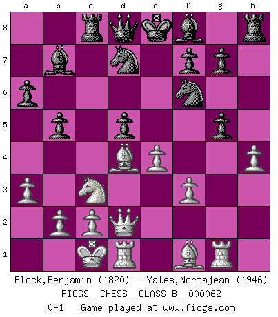 Last move : 0-1 2009 April 1 1:39:39 [Event "FICGS__CHESS__CLASS_B__000062"] [Site "FICGS"] [Date "2008.11.15"] [Round "1"] [White "Block,Benjamin"] [Black "Yates,Normajean"] [Result "0-1"] [WhiteElo "1820"] [BlackElo "1946"] 1.e4 c5 2.Nf3 d6 3.d4 cxd4 4.Nxd4 Nf6 5.Nc3 a6 6.Be3 e6 7.f3 b5 8.g4 h6 9.a3 Bb7 10.Qd2 Nbd7 11.O-O-O Rc8 12.h4 d5 13.Rg1 e5 14.g5 exd4 15.Bxd4 hxg5 0-1 This chess game has been lost on time (started : 2008.11.15 20:31:21) Sicilian : Najdorf, Byrne (English) attack Queenside Castling by player White (move 11) Player Black won this chess game. Follow this game move after move (download)Half the variations which are calculated in a tournament game turn out to be completely superfluous. Unfortunately, no one knows in advance which half. (Jan Tinman) Deine Wertungszahl - vorausgesetzt einige Jahre schachliche Anstrengung - entspricht etwa dem zehnfachen Deines IQ plus 1000. (Jonathan Levitt) Por tratar de evitar la pérdida de una pieza, muchas personas han perdido una partida de Ajedrez. (Savielly Tartakover) Il n'y a pas de prix trop élevé au scalp de l'ennemi. (Koblentz) I teach you to lie, cheat and steal, and as soon as my back's turned you wait in line ? (Gregory House, House M.D.)