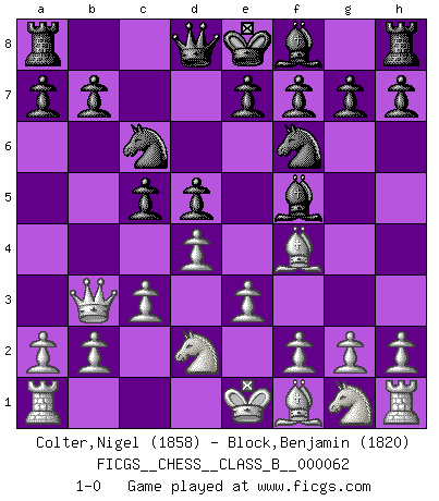 Last move : 1-0 2009 February 17 21:19:28 [Event "FICGS__CHESS__CLASS_B__000062"] [Site "FICGS"] [Date "2008.11.15"] [Round "1"] [White "Colter,Nigel"] [Black "Block,Benjamin"] [Result "1-0"] [WhiteElo "1858"] [BlackElo "1820"] 1.d4 d5 2.Bf4 Nf6 3.e3 c5 4.c3 Nc6 5.Nd2 Bf5 6.Qb3 1-0 This chess game has been lost on time (started : 2008.11.15 20:31:21) Queen's pawn, Mason variation Player White won this chess game. Follow this game move after move (download)Modern Chess is too much concerned with things like Pawn structure. Forget it, Checkmate ends the game. (Nigel Short) Woher wissen wir, daß der Neanderthaler Blindschach gespielt hat? -- Bei Ausgrabungen wurden keine Schachbretter und Figuren gefunden. (Anonymous) Una buena ofensiva y una buena defensa, comienzan ambas con un buen desarrollo. (Bruce A. Moon) Le génie consiste à savoir transgresser les règles au moment opportun. (Teichmann) Lottery : A tax on people who are bad at math. (Author unknown)