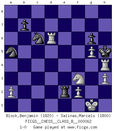 Last move : 1-0 2009 September 10 18:16:17 [Event "FICGS__CHESS__CLASS_B__000062"] [Site "FICGS"] [Date "2008.11.15"] [Round "1"] [White "Block,Benjamin"] [Black "Salinas,Marcelo"] [Result "1-0"] [WhiteElo "1820"] [BlackElo "1800"] 1.h3 e6 2.e3 Bc5 3.d4 Bb4 4.Bd2 Nc6 5.Nf3 Qe7 6.c3 Ba5 7.b4 Bb6 8.b5 Na5 9.c4 c5 10.dxc5 Qxc5 11.Qa4 Qc7 12.Be2 a6 13.O-O Ra7 14.c5 axb5 15.Qd4 e5 16.cxb6 exd4 17.bxa7 dxe3 18.Bxe3 Ne7 19.Na3 O-O 20.a8Q Nec6 21.Nxb5 Qd8 22.Nd6 Qc7 23.Rfd1 Qd8 24.Qxc8 Qxc8 25.Nxc8 Rxc8 26.Rxd7 h6 27.Rad1 Re8 28.g4 g6 29.R1d6 Kg7 30.Bxh6+ Kxh6 31.Rxf7 Re7 32.g5+ Kh5 33.Rf4 Rxe2 34.Rh4+ 1-0 Comment by player 2 : Marcelo Salinas : Hope my oponent are well..... Clemenz (Mead's, Basman's or de Klerk's) Opening Kingside Castling by player White (move 13) Kingside Castling by player Black (move 19) Promotion Queen by player White (move 20) Player White won this chess game. Follow this game move after move (download)Up to this point White has been following well-known analysis. But now he makes a fatal error: he begins to use his own head. (Siegbert Tarrasch) Jeder Fehler erscheint unglaublich dumm, wenn andre ihn begehen. (Georg Christoph Lichtenberg) Si un gobernante no entiende al Ajedrez, ¿como puede governar él un reinado?. (El Rey Khusros II) Les Cavaliers se révèlent fort utiles dans les positions fermées. D'habitude, les Fous sont un peu plus forts que les Cavaliers dans les positions ouvertes. Qu'on le veuille ou non, il restera toujours des exceptions ! I find television to be very educating. Every time somebody turns on the set, I go in the other room and read a book. (Groucho Marx)