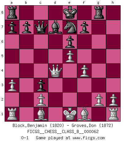 Last move : 0-1 2009 March 15 18:13:25 [Event "FICGS__CHESS__CLASS_B__000062"] [Site "FICGS"] [Date "2008.11.15"] [Round "1"] [White "Block,Benjamin"] [Black "Groves,Don"] [Result "0-1"] [WhiteElo "1820"] [BlackElo "1872"] 1.e4 e6 2.d4 d5 3.Nc3 Bb4 4.e5 c5 5.a3 Bxc3+ 6.bxc3 Ne7 7.Qg4 Qc7 8.Qxg7 Rg8 9.Qxh7 cxd4 10.Ne2 Nbc6 11.f4 dxc3 12.Qd3 d4 13.Nxd4 Nxd4 14.Qxd4 Bd7 0-1 This chess game has been lost on time (started : 2008.11.15 20:31:21) French : Winawer, Advance, poisoned pawn variation Player Black won this chess game. Follow this game move after move (download)Could we look into the head of a Chess player, we should see there a whole world of feelings, images, ideas, emotion and passion. (Alfred Binet) Kombinieren und Schwarzhandel gehören verboten. (Savielly Grigorievitsch Tartakower) No nos podemos resistir a la fascinación de un sacrificio ya que la pasión por los sacrificios es parte de la naturaleza de un jugador de Ajedrez. (Rudolf Spielman) Si rien de grave n'est détecté lors de l'analyse d'une position, on joue alors le coup. Seconde règle de Blumenfeld. If you are going through hell, keep going. (Winston Churchill)
