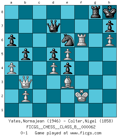 Last move : 0-1 2010 January 13 20:16:42 [Event "FICGS__CHESS__CLASS_B__000062"] [Site "FICGS"] [Date "2008.11.15"] [Round "1"] [White "Yates,Normajean"] [Black "Colter,Nigel"] [Result "0-1"] [WhiteElo "1946"] [BlackElo "1858"] 1.e4 c6 2.d4 d5 3.e5 g6 4.c4 Na6 5.Nc3 Nc7 6.Nf3 Nh6 7.Qb3 a6 8.cxd5 cxd5 9.Be2 Bg7 10.h3 O-O 11.O-O Rb8 12.Bd2 Bd7 13.Rac1 Bc6 14.Na4 Bxa4 15.Qxa4 Ne6 16.Rc2 f6 17.Bd3 Qe8 18.Qb4 Qd7 19.Re1 Nf7 20.exf6 exf6 21.Qb6 Rfe8 22.h4 Nd6 23.h5 f5 24.h6 Bf6 25.Ne5 Qd8 26.Qb3 Ne4 27.Bxe4 fxe4 28.Be3 Qd6 29.Rec1 Bh8 30.a3 Rf8 31.a4 Bf6 32.f4 Bh4 33.Kh2 Bf6 34.g3 g5 35.Rf1 gxf4 36.gxf4 Kh8 37.Kg1 Bxe5 38.fxe5 Rg8+ 39.Rg2 Rxg2+ 40.Kxg2 Qd7 41.Rf6 Rg8+ 42.Kf2 b5 0-1 This chess game has been lost on time (started : 2008.11.15 20:31:21) Caro-Kann : Advance variation Kingside Castling by player Black (move 10) Kingside Castling by player White (move 11) Player Black won this chess game. Follow this game move after move (download)The hallmark of the artist is simplicity. (Larry Evans) Mein erstes Ziel war nicht, die Partie zu gewinnen, sondern eine Figur zu opfern. -- der junge (Wilhelm Steinitz) Solo los afeminados hacen el Enroque. (Rob Sillars) La vérité est comme le meilleur coup aux échecs : elle existe, mais il faut la chercher. (Arturo Perez-Reverte) Opportunities multiply as they are seized. (Sun Tzu)