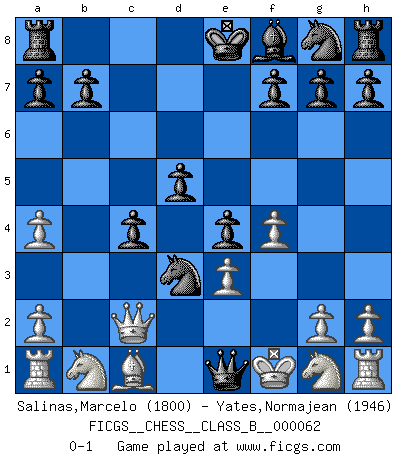 Last move : 0-1 2008 December 15 2:30:45 [Event "FICGS__CHESS__CLASS_B__000062"] [Site "FICGS"] [Date "2008.11.15"] [Round "1"] [White "Salinas,Marcelo"] [Black "Yates,Normajean"] [Result "0-1"] [WhiteElo "1800"] [BlackElo "1946"] 1.e3 d5 2.Bb5 c6 3.Ba4 e5 4.d4 Nd7 5.f4 e4 6.c4 dxc4 7.d5 Nc5 8.Bc2 cxd5 9.Ba4 Bd7 10.b3 Nd3+ 11.Kf1 Bxa4 12.bxa4 Qh4 13.Qc2 Qe1+ 0-1 Van't Kruijs Opening Player Black won this chess game. Follow this game move after move (download)When I asked Fischer why he had not played a certain move in our game, he replied: 'Well, you laughed when I wrote it down !' (Mikhail Tal) Ich glaube nicht an Psychologie, ich glaube an gute Züge. (Robert James Fischer) Bobby es la celebridad menos entendida y malinterpretada que camina el la faz de esta tierra. (Yasser Seirawan) A chaque perte on perd un peu de soi. (Joël Lautier) Don't anthropomorphize computers - they hate it. (Anonymous)