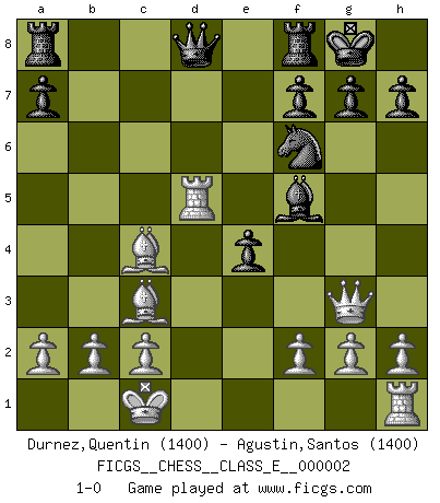 Last move : 1-0 2006 April 23 22:18:38 [Event "FICGS__CHESS__CLASS_E__000002"] [Site "FICGS"] [Date "2006.04.15"] [Round "1"] [White "Durnez,Quentin"] [Black "Agustin,Santos"] [Result "1-0"] [WhiteElo "1400"] [BlackElo "1400"] 1.e4 c5 2.Nf3 Nc6 3.d4 cxd4 4.Nxd4 e5 5.Nxc6 bxc6 6.Bc4 Nf6 7.Nc3 Bb4 8.Bd2 O-O 9.Qf3 d5 10.exd5 Bxc3 11.Bxc3 e4 12.Qg3 Bf5 13.O-O-O cxd5 14.Rxd5 1-0 Sicilian : Labourdonnais-Loewenthal variation Kingside Castling by player Black (move 8) Queenside Castling by player White (move 13) Player White won this chess game. Follow this game move after move (download)When your house is on fire, you can't be bothered with the neighbors. Or, as we say in Chess, if your King is under attack you don't worry about losing a Pawn on the Queen's side. (Gary Kasparov) Wenn du auf das Glück wartest, wird das Leben ziemlich langweilig. (Mikhail Nekhemyevich Tal) Mi estilo es algo parecido entre un poco de Tal y Petrosian. (Reshevsky) Pour moi, les échecs ne sont pas un jeu mais un art. (Alexandre Alekhine) A married woman is like a fish riding a bicycle. (Rodolfo d'Ettorre)