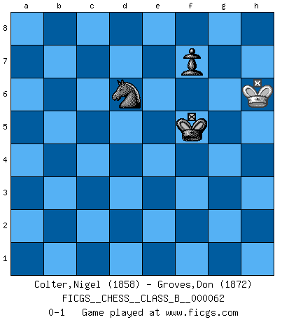 Last move : 0-1 2009 August 10 0:50:5 [Event "FICGS__CHESS__CLASS_B__000062"] [Site "FICGS"] [Date "2008.11.15"] [Round "1"] [White "Colter,Nigel"] [Black "Groves,Don"] [Result "0-1"] [WhiteElo "1858"] [BlackElo "1872"] 1.d4 Nf6 2.Bg5 Ne4 3.Bf4 c5 4.f3 Qa5+ 5.c3 Nf6 6.Nd2 cxd4 7.Nb3 Qb6 8.Qxd4 Nc6 9.Qxb6 axb6 10.Bg5 d5 11.Nd4 Bd7 12.Nb5 Rc8 13.a4 h6 14.Bxf6 gxf6 15.e4 dxe4 16.fxe4 Na5 17.Nh3 Nb3 18.Rd1 Nc5 19.Nf4 e6 20.Nh5 Be7 21.Nd6+ Bxd6 22.Rxd6 Ke7 23.Rxb6 Bxa4 24.b4 Nd7 25.Rxb7 Rxc3 26.Ra7 Bc6 27.Kd2 Rb3 28.b5 Ra8 29.Rxa8 Bxa8 30.Ng3 Nc5 31.Bc4 Ra3 32.Rc1 Bxe4 33.Nxe4 Nxe4+ 34.Ke2 Kd6 35.Bd3 Nc5 36.Bc4 f5 37.g3 Ne4 38.Bd3 Ra2+ 39.Kf3 Ng5+ 40.Ke3 Rxh2 41.Rc6+ Kd5 42.Bc4+ Ke5 43.b6 Rb2 44.Rc5+ Kd6 45.Rb5 Rxb5 46.Bxb5 e5 47.Bd3 Ne4 48.g4 Kc6 49.gxf5 Nd6 50.b7 Kxb7 51.Kf3 Kc6 52.Kg4 Kd5 53.Kh5 e4 54.Bxe4+ Kxe4 55.Kxh6 Kxf5 0-1 Trompowsky attack (Ruth, Opovcensky Opening) 10 pieces endgame at move 46 : White KBPP , Black KNPPPP WHITE : King + 1 Bishop 2 Pawns BLACK : King + 1 Knight 4 Pawns 9 pieces endgame at move 49 : White KBPP , Black KNPPP WHITE : King + 1 Bishop 2 Pawns BLACK : King + 1 Knight 3 Pawns 8 pieces endgame at move 50 : White KBP , Black KNPPP WHITE : King + 1 Bishop 1 Pawn BLACK : King + 1 Knight 3 Pawns 7 pieces endgame at move 54 : White KBP , Black KNPP WHITE : King + 1 Bishop 1 Pawn BLACK : King + 1 Knight 2 Pawns 6 pieces endgame at move 54 : White KP , Black KNPP WHITE : King + 1 Pawn BLACK : King + 1 Knight 2 Pawns 5 pieces endgame at move 55 : White KP , Black KNP WHITE : King + 1 Pawn BLACK : King + 1 Knight 1 Pawn 4 pieces endgame at move 55 : White K , Black KNP WHITE : King + BLACK : King + 1 Knight 1 Pawn Player Black won this chess game. Follow this game move after move (download)Play the opening like a book, the middle game like a magician, and the endgame like a machine. (Spielmann) Die Partien sind immer verschieden, die Interviews immer die gleichen. (Garry Kasparov) Cuando tu casa esta en llamas, no puedes ser molestado por tus vecinos. O, como decinos en Ajedrez, si tu Rey esta bajo ataque, no te preocupa perder un Peón del lado de la Reina. (Gary Kasparov) Si je n'étais pas joueur d'échecs, je serais le meilleur dans quelque chose d'autre. (Anatoli Karpov) Ah, the Socrating method. The best way we have of teaching everything-apart from juggling chainsaws. (Gregory House, House M.D.)