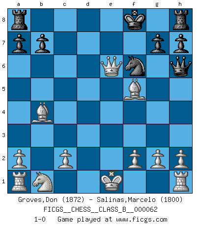 Last move : 1-0 2008 December 6 0:15:49 [Event "FICGS__CHESS__CLASS_B__000062"] [Site "FICGS"] [Date "2008.11.15"] [Round "1"] [White "Groves,Don"] [Black "Salinas,Marcelo"] [Result "1-0"] [WhiteElo "1872"] [BlackElo "1800"] 1.e4 e6 2.d3 Qf6 3.Nf3 Nc6 4.d4 d5 5.Bd3 Nxd4 6.Nxd4 e5 7.Nb5 Bb4 8.Bd2 Bd6 9.exd5 e4 10.Bxe4 Qxb2 11.Nxd6+ Kd7 12.Bc3 Qb6 13.Nxc8 Qh6 14.Bf5+ Kd8 15.d6 cxd6 16.Nxd6 Nf6 17.Nxf7+ Ke7 18.Qd6+ Kxf7 19.Qe6+ Kf8 20.Bb4+ 1-0 French : King's Indian attack Player White won this chess game. Follow this game move after move (download)Fischer prefers to enter Chess history alone. (Miguel Najdorf) Sicherlich können nur Meister einen Stil haben. Daß ein nicht-Meister auch nur ein einziges Mal in seinem Leben eine Partie folgerecht durchführte, habe ich niemals bemerkt. (Emanuel Lasker) Los problemas de Ajedrez exigen del compositor las mismas virtudes que caracterizan todo el arte de valor: originalidad, invención, concisión, armonía, complejidad e insinceridad explendida. (Vladimir Nabokov) On est toujours la mazette de quelqu'un d'autre. (Anonyme) Go and wake up your luck. (Persian saying)
