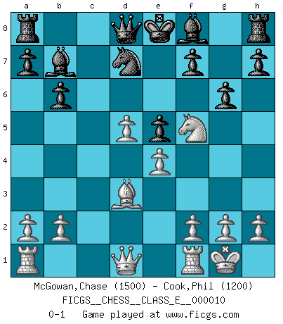 Last move : 0-1 2006 November 11 10:6:48 [Event "FICGS__CHESS__CLASS_E__000010"] [Site "FICGS"] [Date "2006.08.19"] [Round "1"] [White "McGowan,Chase"] [Black "Cook,Phil"] [Result "0-1"] [WhiteElo "1500"] [BlackElo "1200"] 1.d4 Nf6 2.c4 b6 3.Nc3 Bb7 4.Bf4 d6 5.e3 Nbd7 6.Nf3 e6 7.Bd3 c5 8.O-O Be7 9.e4 cxd4 10.Nxd4 e5 11.Bxe5 dxe5 12.Nf5 Bf8 13.Nd5 Nxd5 14.cxd5 g6 0-1 Queen's Indian Accelerated Kingside Castling by player White (move 8) Player Black won this chess game. Follow this game move after move (download)The defensive power of a pinned piece is only imaginary. (Aaron Nimzovich) Ich bin Weltmeister und muß mit niemandem irgend etwas diskutieren. (Viswanathan Anand) No es tiempo de jugar al Ajedrez cuando la casa esta en llamas. (Proverbio Italiano) Les sacrifices démontrent seulement que quelqu'un a gaffé. (Savielly Tartacover) War is the child of passion, passion is the child of narcissism and narcissism is the child. (...) Another game ? (Thibault de Vassal)