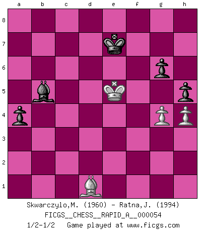 Last move : 1/2-1/2 2009 April 11 20:42:14 [Event "FICGS__CHESS__RAPID_A__000054"] [Site "FICGS"] [Date "2008.11.16"] [Round "1"] [White "Skwarczylo,Marek"] [Black "Ratna,Jean-Michel"] [Result "1/2-1/2"] [WhiteElo "1960"] [BlackElo "1994"] 1.d4 Nf6 2.Nf3 g6 3.c4 Bg7 4.Nc3 d5 5.cxd5 Nxd5 6.e4 Nxc3 7.bxc3 c5 8.Be3 Qa5 9.Qd2 Nc6 10.Rc1 cxd4 11.cxd4 Qxd2+ 12.Kxd2 O-O 13.d5 Rd8 14.Ke1 Na5 15.Bg5 Bd7 16.Bd3 f5 17.e5 Be8 18.d6 Rdc8 19.dxe7 Rxc1+ 20.Bxc1 Nc6 21.Bc4+ Bf7 22.e6 Be8 23.Ba3 Rc8 24.Bb3 Na5 25.Kd1 Nc4 26.Bc1 Nb2+ 27.Bxb2 Bxb2 28.Re1 Kg7 29.Re2 Rc1+ 30.Kd2 Kf6 31.Ne5 Rf1 32.Nc4 Bc1+ 33.Kc3 Kxe7 34.Kd4 Bg5 35.Ne3 Bf6+ 36.Kc5 Rc1+ 37.Rc2 Rxc2+ 38.Nxc2 Be5 39.g3 Bd6+ 40.Kd4 a5 41.a4 f4 42.Ke4 Bc6+ 43.Kd3 Bc5 44.Nd4 Bxd4 45.Kxd4 fxg3 46.fxg3 Kd6 47.Kd3 Bg2 48.Kd4 Bh3 49.e7 Bd7 50.h4 b6 51.Bd1 h6 52.Bc2 Kxe7 53.Ke5 Bf5 54.Bd1 h5 55.Kd5 Bd7 56.Ke5 b5 57.axb5 Bxb5 58.g4 a4 1/2-1/2 King's Indian : East Indian defense Kingside Castling by player Black (move 12) 10 pieces endgame at move 57 : White KBPPP , Black KBPPP WHITE : King + 1 Bishop 3 Pawns BLACK : King + 1 Bishop 3 Pawns 9 pieces endgame at move 57 : White KBPP , Black KBPPP WHITE : King + 1 Bishop 2 Pawns BLACK : King + 1 Bishop 3 Pawns This chess game ended in a draw. Follow this game move after move (download)Chess is like life. (Boris Spassky) Ich organisiere ein großes Turnier, was mich etwa 120000 Dollar kostet. Ich denke, das ist das erste Mal in der Schachgeschichte, daß ein Schachgroßmeister auch als Mäzen auftritt. (Miguel Najdorf) Una victoria por una combinación errónea, aunque sea espectacular, me llena de horror artístico. (Wilhelm Steinitz) Les échecs, c'est l'art d'analyser. (Mikhail Botvinnik) Chess is as much a mystery as women. (Purdy)