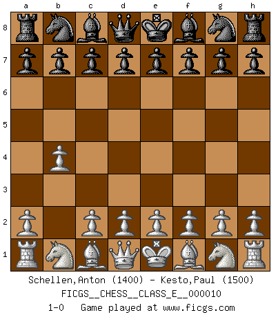 Last move : 1-0 2006 September 28 9:49:16 [Event "FICGS__CHESS__CLASS_E__000010"] [Site "FICGS"] [Date "2006.08.19"] [Round "1"] [White "Schellen,Anton"] [Black "Kesto,Paul"] [Result "1-0"] [WhiteElo "1400"] [BlackElo "1500"] 1.b4 1-0 This chess game has been lost on time (started : 2006.08.19 0:14:49) Polish (Sokolsky) opening Player White won this chess game. Follow this game move after move (download)Your body has to be in top condition. Your Chess deteriorates as your body does. You can't separate body from mind. (Bobby Fischer) Konzentriere dich auf materielle Gewinne. Nimm, was dir dein Gegner gibt, ausser es gibt einen guten Grund der dagegenspricht. (Robert James Fischer) En posiciones complicadas, Bobby Fischer pocas veces tuvo que temer de cualquiera. (Paul Keres) On n'a jamais que l'âge auquel on a commence à jouer aux échecs car après on cesse de vieillir. (Capablanca) I think your argument is specious - I think your tie is ugly. (Gregory House to Dr. Foreman, House M.D.)