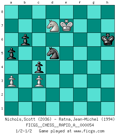 Last move : 1/2-1/2 2008 December 6 19:17:33 [Event "FICGS__CHESS__RAPID_A__000054"] [Site "FICGS"] [Date "2008.11.16"] [Round "1"] [White "Nichols,Scott"] [Black "Ratna,Jean-Michel"] [Result "1/2-1/2"] [WhiteElo "2036"] [BlackElo "1994"] 1.d4 Nf6 2.c3 g6 3.Bg5 Bg7 4.Nf3 O-O 5.Nbd2 d6 6.e4 c5 7.dxc5 dxc5 8.Qc2 Nc6 9.Bc4 Qc7 10.O-O h6 11.Bh4 Nh5 12.Rfd1 g5 13.Nxg5 hxg5 14.Bxg5 Nf4 15.h3 Na5 16.Bd5 e6 17.Bc4 b6 18.Bf1 Bb7 19.g3 Ng6 20.Rac1 f5 21.exf5 Rxf5 22.Ne4 Qe5 23.Bg2 Rxg5 24.Nxg5 Qxg5 25.Bxb7 Nxb7 26.Qe4 Rf8 27.Qxe6+ Kh8 28.h4 Nxh4 29.Qh3 Bh6 30.Qxh4 Qxh4 31.gxh4 Bxc1 32.Rxc1 Nd6 33.Kg2 Nf5 34.Kh3 Ng7 35.Rc2 Rf4 36.Rd2 Kh7 37.Kg2 Rxh4 38.Kf3 Rh6 39.Rd7 Rf6+ 40.Ke4 a5 41.a3 Kg6 42.Kd5 Ne8 43.Re7 Nd6 44.Re6 Rxe6 45.Kxe6 Nc4 46.f4 Nxb2 47.f5+ Kh7 48.f6 Nd3 49.f7 Nf4+ 50.Ke7 c4 51.f8N+ Kh6 52.Nd7 Nd5+ 1/2-1/2 Queen's pawn game Kingside Castling by player Black (move 4) Kingside Castling by player White (move 10) 10 pieces endgame at move 45 : White KPPPP , Black KNPPP WHITE : King + 4 Pawns BLACK : King + 1 Knight 3 Pawns 9 pieces endgame at move 46 : White KPPP , Black KNPPP WHITE : King + 3 Pawns BLACK : King + 1 Knight 3 Pawns Promotion Knight by player White (move 51) This chess game ended in a draw. Follow this game move after move (download)We must make sure that Chess will not be like a dead language, very interesting, but for a very small group. (Sytze Faber) Je mehr wir mit Computern analysieren, desto mehr glauben wir an Verteidigung. (Vladimir Kramnik) Un entendimiento minucioso de las típicas continuaciones de mate hacen de las mas complicadas combinaciones de sacrificio que conducen hacia ellas no solo no dificiles, sino casi un asunto de rutina. (Siegbert Tarrasch) Plusieurs personnes se sont demandées comment Tal faisait pour gagner... En fait, c'est très simple ! Il met ses pièces au centre de l'échiquier et les sacrifie quelque part ! (David Bronstein) See no evil, hear no evil, speak no evil. (The 3 monkeys)