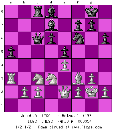 Last move : 1/2-1/2 2009 April 3 13:28:47 [Event "FICGS__CHESS__RAPID_A__000054"] [Site "FICGS"] [Date "2008.11.16"] [Round "1"] [White "Wosch,Arkadiusz"] [Black "Ratna,Jean-Michel"] [Result "1/2-1/2"] [WhiteElo "2004"] [BlackElo "1994"] 1.e4 c5 2.Nf3 d6 3.d4 cxd4 4.Nxd4 Nf6 5.Nc3 a6 6.Be2 e5 7.Nb3 Be6 8.O-O Be7 9.Be3 O-O 10.Qd2 Nbd7 11.a4 Rc8 12.a5 Qc7 13.Rfd1 Rfe8 14.Bf3 h6 15.Nc1 b5 16.axb6 Nxb6 17.Bxb6 Qxb6 18.Nd3 Rc4 19.g3 Rec8 20.Ra4 Rxa4 21.Nxa4 Qb7 22.Qe2 Bd7 23.Ra1 Bd8 24.Ra3 Qc6 25.Nc3 a5 26.Kg2 1/2-1/2 Sicilian : Najdorf, Opovcensky variation Kingside Castling by player White (move 8) Kingside Castling by player Black (move 9) This chess game ended in a draw. Follow this game move after move (download)If Chess is a science, it's a most inexact one. If Chess is an art, it is too exacting to be seen as one. If Chess is a sport, it's too esoteric. If Chess is a game, it's too demanding to be just a game. If Chess is a mistress, she's a demanding one. If Chess is a passion, it's a rewarding one. If Chess is life, it's a sad one. (Unknown) Versuche, dich von der Sklaverei der Eröffnungsvarianten zu befreien. Stattdessen soll man gewisse Typenpositionen erlernen, die man eingehend analysiert. (Aaron Nimzowitsch) Los Peones son el alma de una partida de Ajedrez. (Francois Andre Danican Philidor) Une platitude souvent récitée à propos des Echecs est qu'une des choses les plus difficiles à réaliser est de gagner une position gagnante. Cela ne manque pas de sens mais, pour ma part, j'ai toujours trouvé plus difficile de gagner une position perdante. (Tim Krabbe) Crush them ! Make them suffer ! (General Grievous in Star Wars ep.3)
