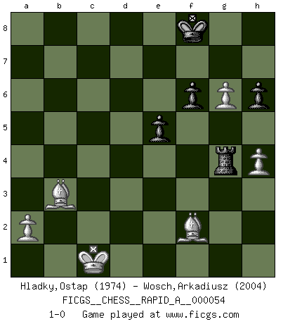 Last move : 1-0 2009 February 27 10:26:24 [Event "FICGS__CHESS__RAPID_A__000054"] [Site "FICGS"] [Date "2008.11.16"] [Round "1"] [White "Hladky,Ostap"] [Black "Wosch,Arkadiusz"] [Result "1-0"] [WhiteElo "1974"] [BlackElo "2004"] 1.e4 c5 2.Nf3 Nc6 3.d4 cxd4 4.Nxd4 Nf6 5.Nc3 d6 6.Bg5 e6 7.Qd3 a6 8.Nxc6 bxc6 9.O-O-O h6 10.Bf4 Ng4 11.Bg3 Qa5 12.Be2 Ne5 13.Qe3 Be7 14.f4 Nd7 15.f5 e5 16.h4 Rb8 17.Be1 Qb6 18.Qxb6 Nxb6 19.g4 d5 20.exd5 cxd5 21.Bg3 f6 22.Nxd5 Nxd5 23.Rxd5 Bb7 24.Rhd1 Bxd5 25.Rxd5 Kf7 26.c3 Rhd8 27.Rxd8 Rxd8 28.Bc4+ Kf8 29.Bxa6 Ra8 30.Bc4 Ra4 31.b4 Bxb4 32.cxb4 Rxb4 33.Bb3 Rxg4 34.Bf2 g5 35.fxg6 1-0 Sicilian defense Queenside Castling by player White (move 9) Player White won this chess game. Follow this game move after move (download)Suddenly it was obvious to me in my analysis I had missed what Fischer had found with the greatest of ease at the board. (Mikhail Botvinnik) Der Knackpunkt bei der Konzentration ist, daß wir nur durch sie etwas Neues und Ungewöhnliches am Schachbrett finden können. Sie ist der einzige Weg durch neue neue Ideen eine Überraschung zu bereiten. (Garry Kasparov) Las piezas de Ajedrez son los bloques del alfabeto que moldean los pensamientos; y esos pensamientos, aunque hagan un diseño visual en el tablero, expresan abstractamente su belleza como un poema. (Marcel Duchamp) Dieu déplace le joueur, et celui-ci la pièce. Quel Dieu derrière Dieu commence donc la trame ? Arturo Perez-Reverte (prix de littérature policière 1993). A bird doesn't sing because it has an answer, it sings because it has a song. (Maya Angelou)