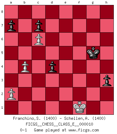 Last move : 0-1 2006 October 4 23:34:8 [Event "FICGS__CHESS__CLASS_E__000010"] [Site "FICGS"] [Date "2006.08.19"] [Round "1"] [White "Franchino,Sebastian"] [Black "Schellen,Anton"] [Result "0-1"] [WhiteElo "1400"] [BlackElo "1400"] 1.e4 e5 2.Nf3 Nc6 3.d4 exd4 4.Nxd4 Bc5 5.Be3 Qf6 6.c3 d6 7.Bb5 Nge7 8.Qe2 O-O 9.Nxc6 bxc6 10.Bd3 Bxe3 11.Qxe3 Re8 12.O-O Nd5 13.Qd4 Qxd4 14.cxd4 Nf4 15.Bc2 Ne2+ 16.Kh1 Ba6 17.Rd1 Rab8 18.b3 Rb4 19.d5 f5 20.f3 Re5 21.dxc6 Nd4 22.Rd2 Nxc2 23.Rxc2 fxe4 24.Nc3 exf3 25.gxf3 Rf4 26.Kg2 h5 27.Rd2 Rg5+ 28.Kf2 Rgf5 29.Kg2 Rxf3 30.Nd5 Rf7 31.Ne7 Kh7 32.Nd5 h4 33.h3 Bc8 34.Re1 Bxh3+ 35.Kh2 g5 36.Re4 g4 37.Re7 Rxe7 38.Nxe7 Bf1 39.Kg1 g3 40.Rd4 h3 41.Rh4 Kg7 42.Nf5 Rxf5 43.Rg4 Kf6 44.Rxg3 Rg5 45.Rxg5 Kxg5 46.Kxf1 d5 47.b4 d4 0-1 Scotch game Kingside Castling by player Black (move 8) Kingside Castling by player White (move 12) 10 pieces endgame at move 45 : White KPPP , Black KBPPPP WHITE : King + 3 Pawns BLACK : King + 1 Bishop 4 Pawns 9 pieces endgame at move 46 : White KPPP , Black KPPPP WHITE : King + 3 Pawns BLACK : King + 4 Pawns Player Black won this chess game. Follow this game move after move (download)Look at Garry Kasparov. After he loses, invariably he wins the next game. He just kills the next guy. That's something that we have to learn to be able to do. (Maurice Ashley) Die Neutralität betrachte ich als eine schwere Krankheit. (Viktor Kortschnoi) La única cosa que los jugadores de Ajedrez tienen en común, es el Ajedrez. (Lodewijk Prins) Des combinaisons [dans le jeu d'échecs] pareilles à des mélodies. Je crois entendre pour ainsi dire la musique des coups... (Vladimir Nabokov) Hold em is to stud what chess is to checkers. (Johnny Moss)