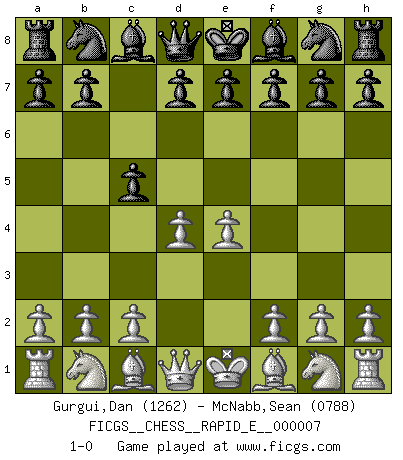 Last move : 1-0 2008 November 22 4:13:21 [Event "FICGS__CHESS__RAPID_E__000007"] [Site "FICGS"] [Date "2008.11.17"] [Round "1"] [White "Gurgui,Dan"] [Black "McNabb,Sean"] [Result "1-0"] [WhiteElo "1262"] [BlackElo "0788"] 1.e4 c5 2.d4 1-0 Sicilian : Smith-Morra gambit Player White won this chess game. Follow this game move after move (download)Chess opens and enriches your mind. (Saudin Robovic) Ohne Fehler kann es keine Brillanz geben. (Emanuel Lasker) Las leyes del Ajedrez no permiten una libre elección: tienes que mover quieras o no. (Emanuel Lasker) Mais l'homme est une créature légère et illogique : semblable au joueur d'échecs, il n'aime que le processus du but à atteindre, non le but lui-même. (Dostoïevsky) It is not titles that honor men, but men that honor titles. (Niccolo Machiavelli)
