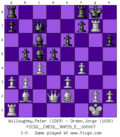 Last move : 1-0 2008 December 3 22:18:25 [Event "FICGS__CHESS__RAPID_E__000007"] [Site "FICGS"] [Date "2008.11.17"] [Round "1"] [White "Willoughby,Peter"] [Black "Orden,Jorge"] [Result "1-0"] [WhiteElo "1269"] [BlackElo "1030"] 1.d4 d5 2.Nf3 Nf6 3.e3 e6 4.Bd3 Be7 5.O-O O-O 6.Nbd2 c5 7.b3 Nc6 8.Bb2 Nb4 9.Be2 h6 10.a3 Nc6 11.c4 b6 12.Ne5 Bb7 13.f4 Qc7 14.Rf3 Ne4 15.dxc5 Nxd2 16.Qxd2 Bxc5 17.Nxc6 Bxc6 18.Rg3 b5 19.Rxg7+ 1-0 Queen's pawn game Kingside Castling by player White (move 5) Kingside Castling by player Black (move 5) Player White won this chess game. Follow this game move after move (download)You know, comrade Pachman, I don't enjoy being a Minister, I would rather play Chess like you. (Che Guevara) Es tut gut, die Entwicklungsperiode von, [...] demokratischem Geist durchdringen zu lassen. Wie undemokratisch wäre es doch beispielsweise, den einen Offizier große Spaziertouren vornehmen zu lassen, während die anderen zu Hause säßen und sich entsetzlich langweilten. (Aaron Nimzowitsch) Una compensación adecuada por un sacrificio es tener una combinación sólida que conduce a una posición ganadora; una compensación adecuada por una metida de pata es dejar a tu oponente arrebatar una derrota de las fauces de la victoria. (Bruce A. Moon) Echiquier : carré parfait, comme la Jérusalem nouvelle décrite par l'auteur de l'Apocalypse, huit cases sur huit, exaltation du chiffre 4, symbole du cosmos aux quatre horizons... où le noir et le blanc, l'ombre et la lumière, le mal et le bien s'entremêlent et se conjuguent. (Robert Couffignal, Le Gambit du poète) . 'gn is not allowed in chess unless n is an integer between 1 and 8 inclusive, where 1 and 8 are to interpreted as the standard numerals standing for integers in the ordered real-closed field R, with the *canonical* ordering. (As opposed to, say, an integer in the domain Z[2+i*sqrt(5)] or an integer in some exotic Grothendieck topos). (Normajean Yates)