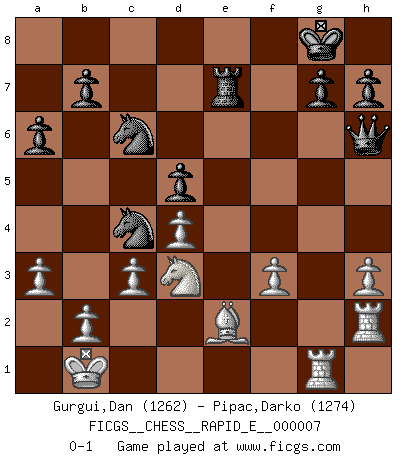 Last move : 0-1 2008 December 17 8:46:36 [Event "FICGS__CHESS__RAPID_E__000007"] [Site "FICGS"] [Date "2008.11.17"] [Round "1"] [White "Gurgui,Dan"] [Black "Pipac,Darko"] [Result "0-1"] [WhiteElo "1262"] [BlackElo "1274"] 1.e4 e5 2.f4 exf4 3.Nf3 d5 4.e5 a6 5.d4 Bg4 6.Bxf4 Nc6 7.c3 f6 8.exf6 Qxf6 9.Qe2+ Be7 10.Bxc7 Rc8 11.Bb6 Nh6 12.Nbd2 O-O 13.O-O-O Rce8 14.h3 Bxf3 15.gxf3 Bd8 16.Bc5 Rxe2 17.Bxe2 Be7 18.Nb3 Bxc5 19.Nxc5 Rf7 20.Rdg1 Nf5 21.Nd3 Re7 22.Rh2 Ne3 23.a3 Qh6 24.Kb1 Nc4 0-1 KGA : Abbazia defense (Classical defense, Modern defense!) Kingside Castling by player Black (move 12) Queenside Castling by player White (move 13) Player Black won this chess game. Follow this game move after move (download)The passed pawn is a criminal, who should be kept under lock and key. Mild measures, such as police surveillance, are not sufficient. (Nimzovitch) Die FIDE ist dabei in die Hände der russischen Mafia zu fallen. (Larry Evans) A través de las casillas del tablero, los Indios explican el movimiento del tiempo y la edad, las influencias mas altas que controlan el mundo y los lazos que vinculan al Ajedrez con el alma humana. (Al-Masudi) Mon pion favori sur ma case favorite ! Bronstein en parlant d'un coup de pion en h5 quand il avait les Noirs. All art requires courage. (Anne Tucker)
