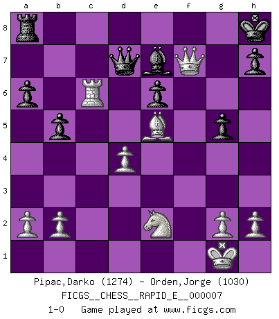 Last move : 1-0 2008 December 15 8:41:38 [Event "FICGS__CHESS__RAPID_E__000007"] [Site "FICGS"] [Date "2008.11.17"] [Round "1"] [White "Pipac,Darko"] [Black "Orden,Jorge"] [Result "1-0"] [WhiteElo "1274"] [BlackElo "1030"] 1.e4 c5 2.Nf3 d6 3.d4 cxd4 4.Nxd4 Nf6 5.Nc3 e6 6.Bg5 Be7 7.f4 O-O 8.e5 dxe5 9.fxe5 Nfd7 10.Bf4 a6 11.Bd3 Nc5 12.Nce2 Nxd3+ 13.cxd3 b5 14.O-O Bb7 15.Nf3 Nc6 16.d4 f6 17.Rc1 g5 18.Bg3 fxe5 19.Nxe5 Rxf1+ 20.Qxf1 Qd5 21.Qf7+ Kh8 22.Nxc6 Bxc6 23.Rxc6 Qd7 24.Be5+ 1-0 Sicilian : Scheveningen variation Kingside Castling by player Black (move 7) Kingside Castling by player White (move 14) Player White won this chess game. Follow this game move after move (download)Modern Chess is too much concerned with things like Pawn structure. Forget it, Checkmate ends the game. (Nigel Short) Stil? Ich habe keinen Stil! (Anatoly Karpov) El Ajedrez, como cualquier actividad creativa, solo puede existir a través del esfuerzo combinado de aquellos que tienen talento creativo y de aquellos que poseen la habilidad de organizar su trabajo creativo. (Mikhail Botvinnik) La tactique est l'élément le plus important du milieu de jeu. (Siegbert Tarrasch) First of all, we have to go back to the classical time control. (Anatoly Karpov)