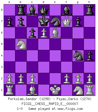 Last move : 1-0 2008 December 18 13:15:30 [Event "FICGS__CHESS__RAPID_E__000007"] [Site "FICGS"] [Date "2008.11.17"] [Round "1"] [White "Porkolab,Sandor"] [Black "Pipac,Darko"] [Result "1-0"] [WhiteElo "1298"] [BlackElo "1274"] 1.e4 e5 2.d4 exd4 3.Qxd4 Nc6 4.Qe3 d5 5.exd5 Nce7 6.Nc3 Nf6 7.Bc4 Ng4 8.Qg3 h5 9.Nb5 h4 10.Qf4 Rb8 11.d6 c6 12.Qxf7+ Kd7 13.Be6+ 1-0 Centre game : Paulsen attack Player White won this chess game. Follow this game move after move (download)There is only one thing Fischer does in Chess without pleasure: to lose ! (Boris Spassky) Ich habe Putins Aufstieg an die Macht beobachtet und seine Politik, die demokratischen Institutionen meines Landes zu zerstören. (Garry Kasparov) Mi estilo es algo parecido entre un poco de Tal y Petrosian. (Reshevsky) Celui qui prend des risques peut perdre, celui qui n'en prend pas perd toujours. (Xavier Tartacover) Beta. Software undergoes beta testing shortly before it's released. Beta is latin for still doesn't work. (Anonymous)