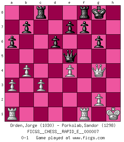 Last move : 0-1 2009 February 20 15:51:19 [Event "FICGS__CHESS__RAPID_E__000007"] [Site "FICGS"] [Date "2008.11.17"] [Round "1"] [White "Orden,Jorge"] [Black "Porkolab,Sandor"] [Result "0-1"] [WhiteElo "1030"] [BlackElo "1298"] 1.e4 c5 2.Nf3 d6 3.d4 cxd4 4.Nxd4 Nf6 5.Nc3 a6 6.Bd3 g6 7.O-O Bg7 8.h3 O-O 9.Be3 Nc6 10.f4 Bd7 11.a3 Ng4 12.hxg4 Bxd4 13.Bxd4 Nxd4 14.Ne2 Bxg4 15.c3 Ne6 16.f5 Qb6+ 17.Kh2 Nc5 18.b4 Nxd3 19.Qxd3 Bxe2 20.Qxe2 Qb5 21.Qg4 Qe5+ 22.Kh1 Rac8 23.fxg6 hxg6 0-1 Sicilian : Najdorf Kingside Castling by player White (move 7) Kingside Castling by player Black (move 8) Player Black won this chess game. Follow this game move after move (download)Chess is not like life... it has rules ! (Mark Pasternak) Ein typischer, sehr verbreiteter Gedankenschädling ist der, daß der betreffende Amateur von der Annanhme ausgeht, daß jeder einzelne Zug etwas zu leisten habe. (Aaron Nimzowitsch) Cuando me preguntan: -¿Cual es el secreto que te hace hacer mejores movidas que tus oponentes?, Yo respondo: Me da gusto que me pregunten eso, porque, como veran, hay una simple razón. Yo pienso mis propias movidas y dejo a mi oponente que el piense las suyas. (Alexander Alekhine) Le moment que je préfère le plus dans une rencontre, c'est celui où je sens que la personnalité de l'adversaire se brise. (Robert Fischer) The right perception of any matter and a misunderstanding of the same matter do not wholly exclude each other. (Kafka's the trial)