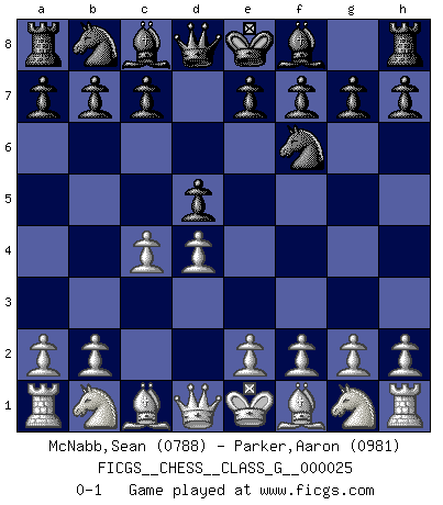 Last move : 0-1 2008 November 22 4:12:42 [Event "FICGS__CHESS__CLASS_G__000025"] [Site "FICGS"] [Date "2008.11.18"] [Round "1"] [White "McNabb,Sean"] [Black "Parker,Aaron"] [Result "0-1"] [WhiteElo "0788"] [BlackElo "0981"] 1.d4 d5 2.c4 Nf6 0-1 QGD : Marshall defense Player Black won this chess game. Follow this game move after move (download)All my games are real. (Bobby Fischer) Computer sind die einzigen Gegner, die nicht immer eine Ausrede auf Lager haben, wenn sie gegen mich verlieren. (Robert James Fischer) El Ajedrez es imaginación. (David Bronstein) Les échecs, c'est l'art d'analyser. (Mikhail Botvinnik) Winning isn't everything... but losing is nothing. (Mednis)