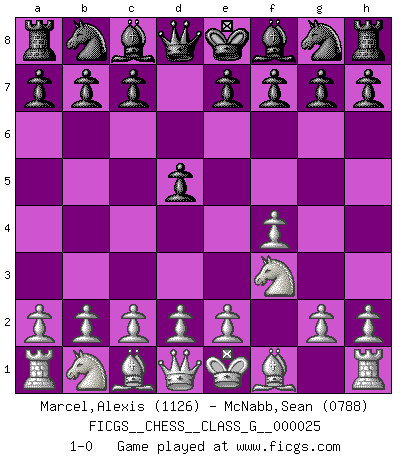 Last move : 1-0 2008 November 22 4:13:17 [Event "FICGS__CHESS__CLASS_G__000025"] [Site "FICGS"] [Date "2008.11.18"] [Round "1"] [White "Marcel,Alexis"] [Black "McNabb,Sean"] [Result "1-0"] [WhiteElo "1126"] [BlackElo "0788"] 1.f4 d5 2.Nf3 1-0 Bird's Opening Player White won this chess game. Follow this game move after move (download)If I win a tournament, I win it by myself. I do the playing. Nobody helps me. (Bobby Fischer) Eine Person mit durchschnittlichem IQ kann etwa eine ELO von 2000 erreichen. (Jonathan Levitt) En el Ajedrez, tal como es jugado por los Maestros, practicamente la suerte es eliminada. (Emanuel Lasker) À la honte des hommes, on sait que les lois du jeu sont les seules qui soient partout justes, claires, inviolables et exécutées. Pourquoi l'Indien qui a donné les règles du jeu d'échecs est-il obéi de bon gré dans toute la terre, et que les décrétales des papes, par exemple, sont aujourd'hui un objet d'horreur et de mépris ? C'est que l'inventeur des échecs combina tout avec justesse pour la satisfaction des joueurs, et que les papes, dans leurs décrétales, n'eurent en vue que leur seul avantage. L'Indien voulut exercer également l'esprit des hommes et leur donner du plaisir; les papes ont voulu abrutir l'esprit des hommes. Voltaire (Dictionnaire philosophique / Garnier 1967) There is far too much law for those who can afford it and far too little for those who cannot. (Derek Bok)