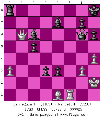 Last move : 0-1 2008 November 25 21:57:8 [Event "FICGS__CHESS__CLASS_G__000025"] [Site "FICGS"] [Date "2008.11.18"] [Round "1"] [White "Benreguia,Frederic"] [Black "Marcel,Alexis"] [Result "0-1"] [WhiteElo "1103"] [BlackElo "1126"] 1.Nf3 f5 2.d4 Nf6 3.Nc3 e6 4.Bd2 Be7 5.e3 b6 6.a3 Bb7 7.b4 O-O 8.Bd3 h6 9.Nh4 Qe8 10.Nb5 Bd8 11.Bc4 Kh8 12.Bd3 a6 13.Nc3 Nd5 14.Nxd5 Bxd5 15.O-O Bxh4 16.c4 Bb7 17.f3 Qg6 18.Qe2 Nc6 19.b5 axb5 20.g3 bxc4 21.Bxc4 Ne7 22.Bb4 d5 23.Bd3 Rac8 24.e4 fxe4 25.fxe4 dxe4 26.Bc4 Rxf1+ 27.Rxf1 c5 28.dxc5 bxc5 29.Bc3 Nd5 30.Bxd5 exd5 31.Kh1 Bg5 32.h4 Be7 33.Qb5 Bc6 34.Qa6 Ra8 35.Qb6 d4 36.Be1 e3 37.Kh2 d3 0-1 Reti v Dutch Kingside Castling by player Black (move 7) Kingside Castling by player White (move 15) Player Black won this chess game. Follow this game move after move (download)Chess is a matter of delicate judgment, knowing when to punch and how to duck. (Bobby Fischer) Nie in meinem Leben habe ich die französische Verteidigung gespielt, welche die Stumpfsinnigste von allen ist. (Wilhelm Steinitz) Evita las multitudes. Haz independientemente tu propio razonamiento. Trata de ser el jugador de Ajedrez, no la pieza de Ajedrez. (Ralph Charell) Avec des compensations pour le matériel en plus... (Anonyme) In every real man a child is hidden that wants to play. (Friedrich Nietzsche)