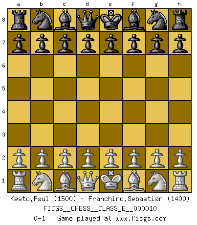 Last move : 0-1 2006 September 28 3:46:26 [Event "FICGS__CHESS__CLASS_E__000010"] [Site "FICGS"] [Date "2006.08.19"] [Round "1"] [White "Kesto,Paul"] [Black "Franchino,Sebastian"] [Result "0-1"] [WhiteElo "1500"] [BlackElo "1400"] 0-1 This chess game has been lost on time (started : 2006.08.19 0:14:49) Player Black won this chess game. Follow this game move after move (download)Chess teaches you to control the initial excitement you feel when you see something that looks good and it trains you to think objectively when you're in trouble. (Stanley Kubrick) Weshalb minderdergeübte Spieler mit g2-g4 beginnen? Die betreffenden sind unschlüssig, ob sie nun rechts (h4) oder links (f4) beginnen sollen, und in ihrer Ratlosigkeit entschliessen sie sich nach guter Bürgerart dazu, den goldenen Mittelweg zu wählen. (Aaron Nimzowitsch) Tu cuerpo tiene que estar en óptima condición. Tu Ajedrez se deteriora como lo hace tu cuerpo. No puedes separar la mente y el cuerpo. (Bobby Fischer) L'action d'une oeuvre littéraire se déroule sur un champ de bataille. Les masques et les types du drame moderne correspondent aux pièces du jeu d'échecs. L'intrigue correspond aux coups et aux gambits, c'est à dire aux techniques du jeu telles qu'utilisées et interprétées par les joueurs. Les tactiques et les péripéties [mouvements] correspondent aux coups exécutés par l'adversaire. (Viktor Shklovsky) Unless in communicating with it one says exactly what one means, trouble is bound to result. (Alan Turing, about computers)