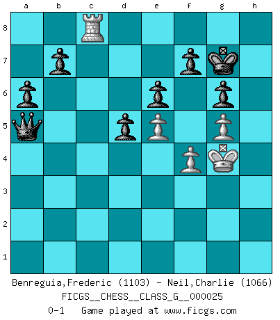 Last move : 0-1 2008 December 30 14:17:36 [Event "FICGS__CHESS__CLASS_G__000025"] [Site "FICGS"] [Date "2008.11.18"] [Round "1"] [White "Benreguia,Frederic"] [Black "Neil,Charlie"] [Result "0-1"] [WhiteElo "1103"] [BlackElo "1066"] 1.Nc3 d5 2.d4 e6 3.Nf3 Nf6 4.e3 Bb4 5.Bd2 c5 6.Bb5+ Bd7 7.Ne5 cxd4 8.Bxd7+ Nbxd7 9.exd4 Bxc3 10.Bxc3 O-O 11.Qe2 Nxe5 12.dxe5 Nd7 13.O-O Re8 14.b4 Rc8 15.Bd4 a6 16.a4 Nf8 17.a5 Qc7 18.c3 Ng6 19.Rac1 Qc4 20.Qe3 Ne7 21.Bc5 Nf5 22.Qe1 h6 23.Qd1 Qe4 24.Re1 Qh4 25.f3 Qc4 26.g4 Nh4 27.Kf2 Ng6 28.h3 Nf4 29.h4 Nd3+ 30.Kg2 Nxc1 31.Qxc1 Qa2+ 32.Kg3 Qa4 33.g5 hxg5 34.hxg5 Qd7 35.f4 Qb5 36.Rh1 Rxc5 37.bxc5 Qd3+ 38.Kg2 Qe4+ 39.Kg3 Qd3+ 40.Kf2 Qe4 41.Rh4 Rc8 42.Qg1 Rxc5 43.Qg3 Qc2+ 44.Kg1 Qxc3 45.Qh2 Qc1+ 46.Kf2 Rc2+ 47.Kg3 Rxh2 48.Rxh2 Qc3+ 49.Kg4 Qxa5 50.Rc2 g6 51.Rc8+ Kg7 0-1 Dunst (Sleipner, Heinrichsen) Opening Kingside Castling by player Black (move 10) Kingside Castling by player White (move 13) Player Black won this chess game. Follow this game move after move (download)What would Chess be without silly mistakes ? (Kurt Richter) Es hat in meinem Leben Zeiten gegeben, da ich sehr nahe daran war zu glauben, daß ich auch nicht eine einzige Schachpartie verlieren könnte. (José Raúl Capablanca) Los libros de Ajedrez deben de usarse igual como usamos los anteojos: para mejorar la vista, aunque algunos jugadores los quieren usar como si ellos les otorgaran la vision. (José Raúl Capablanca) Le joueur d'Echecs qui veut atteindre le top est obligé de développer son propre credo créatif. Alexeï Stepanovicth Souétine. Il est facile d'écrire des livres ! Ce qui est difficile, c'est de jouer ! (Alexeï Stepanovicth Souétine) Whoever said the pen is mightier than the sword obviously never encountered automatic weapons. (US General Douglas MacArthur)