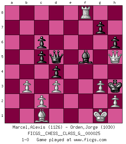 Last move : 1-0 2008 December 6 17:17:51 [Event "FICGS__CHESS__CLASS_G__000025"] [Site "FICGS"] [Date "2008.11.18"] [Round "1"] [White "Marcel,Alexis"] [Black "Orden,Jorge"] [Result "1-0"] [WhiteElo "1126"] [BlackElo "1030"] 1.f4 d5 2.Nf3 c5 3.e3 Nf6 4.b3 e6 5.Bb2 Be7 6.Be2 O-O 7.O-O Nc6 8.Ne5 Nd7 9.Nxc6 bxc6 10.d3 a5 11.Nd2 a4 12.Qc1 axb3 13.axb3 Nb6 14.Rxa8 Qc7 15.Ra1 f6 16.Ba3 d4 17.e4 Bd6 18.Nc4 Bd7 19.Nxd6 Qxd6 20.Qd2 e5 21.fxe5 Qxe5 22.Bb2 Be6 23.Ra6 Qc7 24.Rfa1 f5 25.Ra7 Qe5 26.exf5 Bxf5 27.Bf3 Nd5 28.Bxd5+ Qxd5 29.Ra8 h6 30.Rxf8+ Kxf8 31.Ra8+ Ke7 32.Qe2+ Kf6 33.Rf8+ Kg6 34.Qe8+ Kg5 35.Bc1+ Kg4 36.Qe2+ Kh4 37.g3+ Kh3 38.Qh5+ 1-0 Bird's Opening Kingside Castling by player Black (move 6) Kingside Castling by player White (move 7) Player White won this chess game. Follow this game move after move (download)There must have been a time when men were demigods, or they could not have invented Chess. (Gustav Schenk) Wer der Ansicht ist, daß alle Schachspieler verrückt sind, wird durch Studium des Lebens von Emil Josef Diemer nicht auf andere Gedanken kommen. (Hans Ree) El Ajedrez tiene tanto misterio como las mujeres. (Purdy) Echiquier : carré parfait, comme la Jérusalem nouvelle décrite par l'auteur de l'Apocalypse, huit cases sur huit, exaltation du chiffre 4, symbole du cosmos aux quatre horizons... où le noir et le blanc, l'ombre et la lumière, le mal et le bien s'entremêlent et se conjuguent. (Robert Couffignal, Le Gambit du poète) Inventor: A person who makes an ingenious arrangement of wheels, levers and springs, and believes it civilization. (Ambrose Bierce, The Devil's Dictionary)